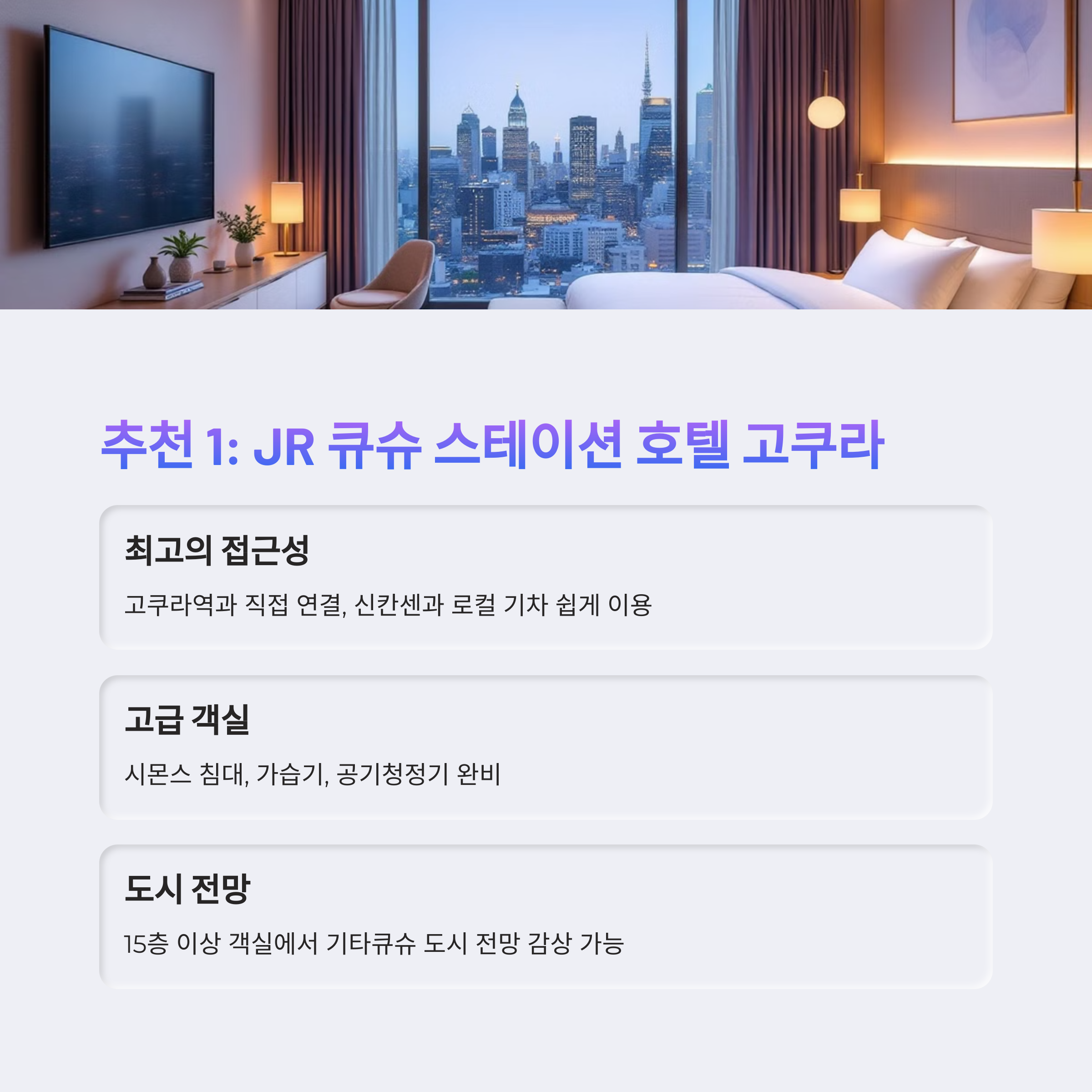 기타큐슈 여행의 핵심은 바로 편리한 교통과 편안한 숙박이에요. 고쿠라역 주변 호텔들은 접근성이 뛰어나 여행의 효율성을 극대화할 수 있답니다. 특히 JR 큐슈 스테이션 호텔 고쿠라는 역과 직접 연결되어 있어 이동이 편리하고, 다양한 편의시설과 서비스를 제공해 여행객들에게 큰 사랑을 받고 있어요.