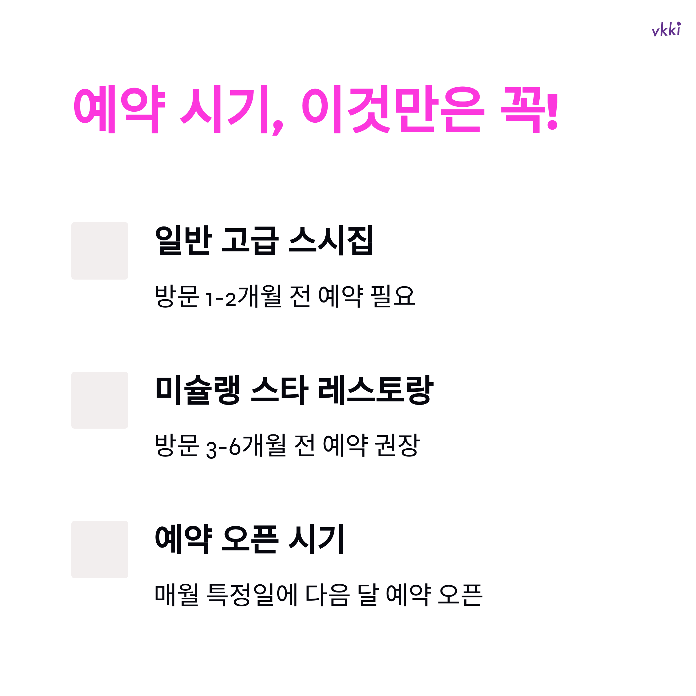 - 예약 오픈 시기: 많은 레스토랑이 매월 특정일(예: 25일)에 다음 달 예약을 오픈