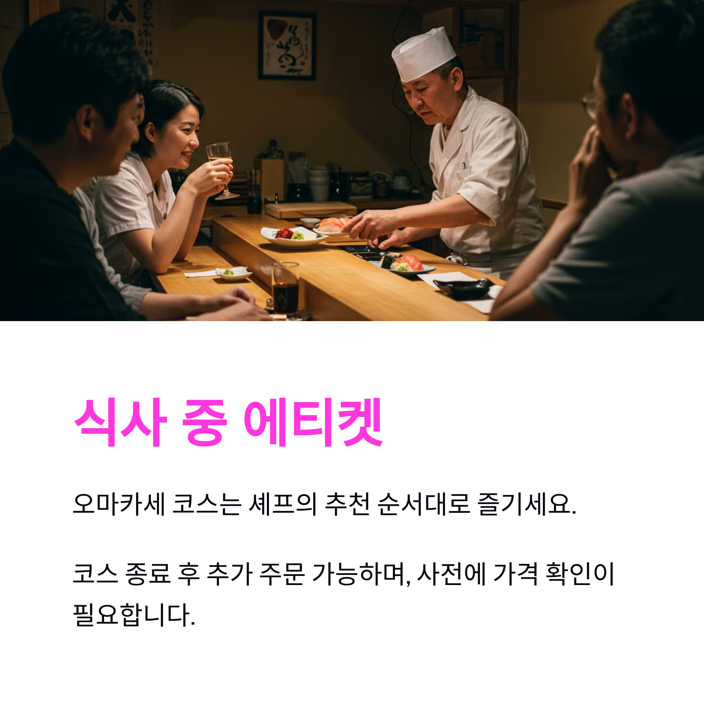- 오마카세 코스: 셰프의 추천 순서대로 즐기는 것이 좋음