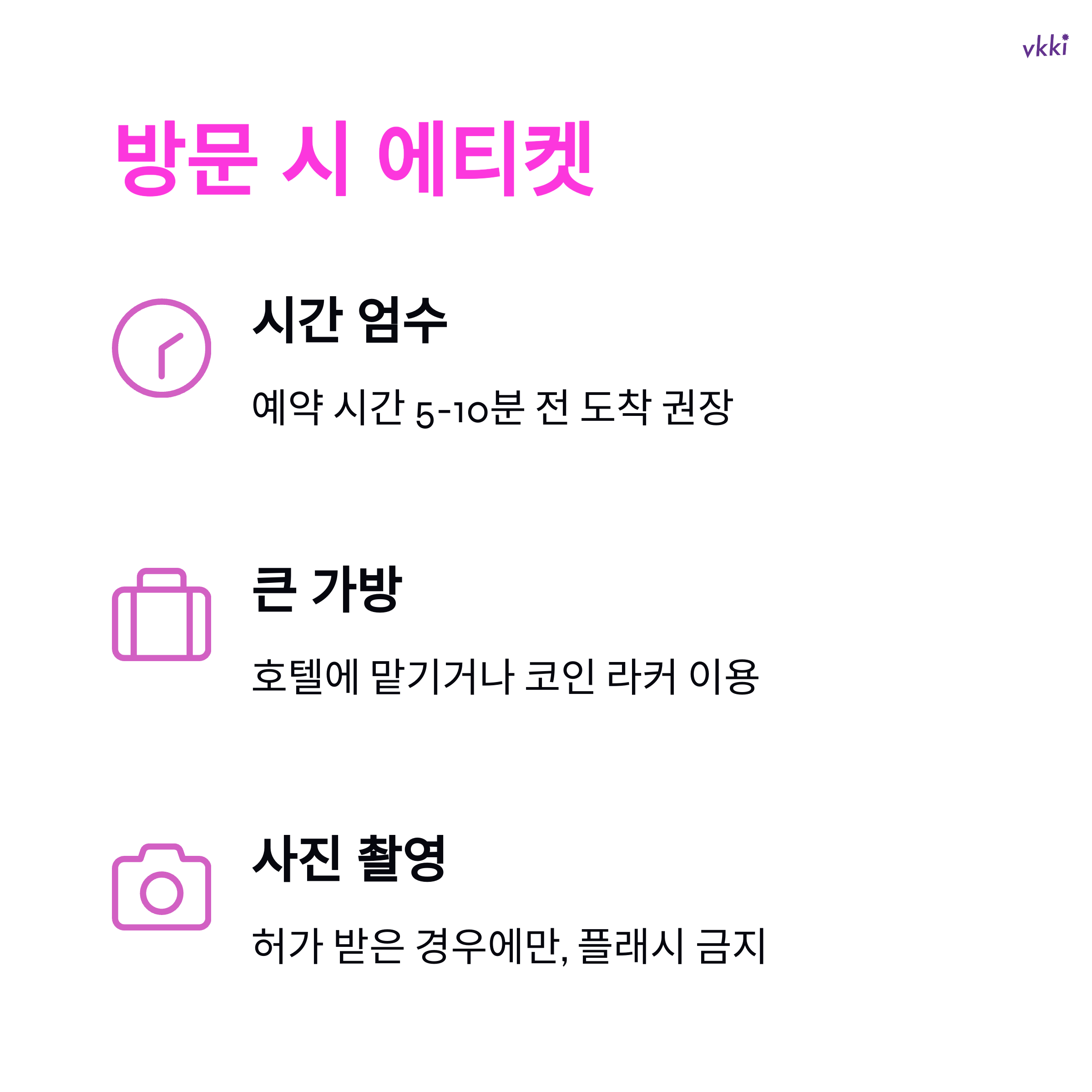 - 향수: 강한 향수는 착용 자제 (입장 거부될 수 있음)