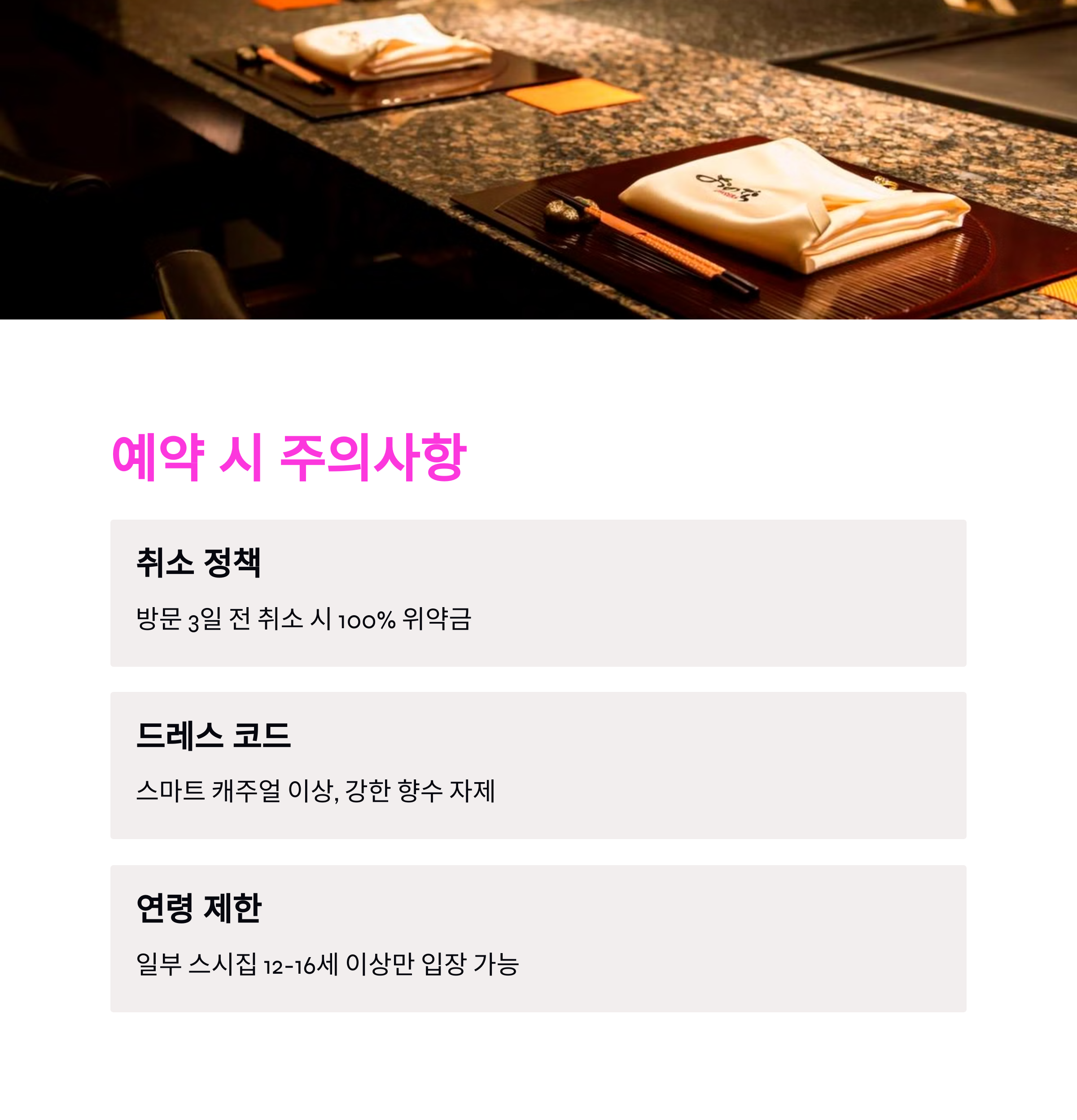 - 향수: 강한 향수는 다른 손님에게 방해가 될 수 있어 자제 요망