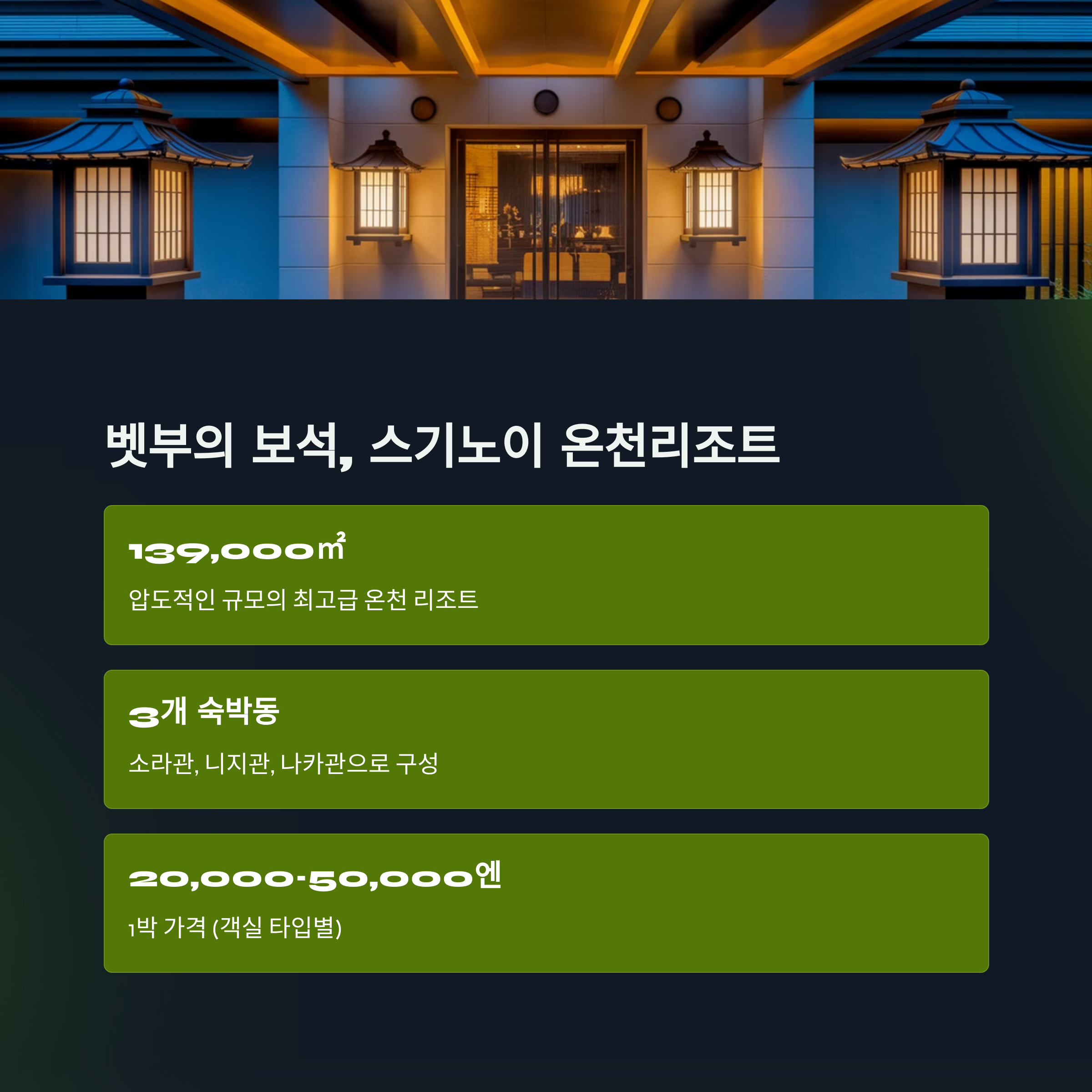 벳부 여행을 더욱 특별하게 만들어 줄 **스기노이 온천리조트**! 가족, 친구, 연인과 함께 완벽한 힐링을 경험할 수 있는 곳입니다. 다양한 온천 시설과 부대시설을 갖춘 이곳에서 **최고의 온천 여행**을 즐겨보세요!