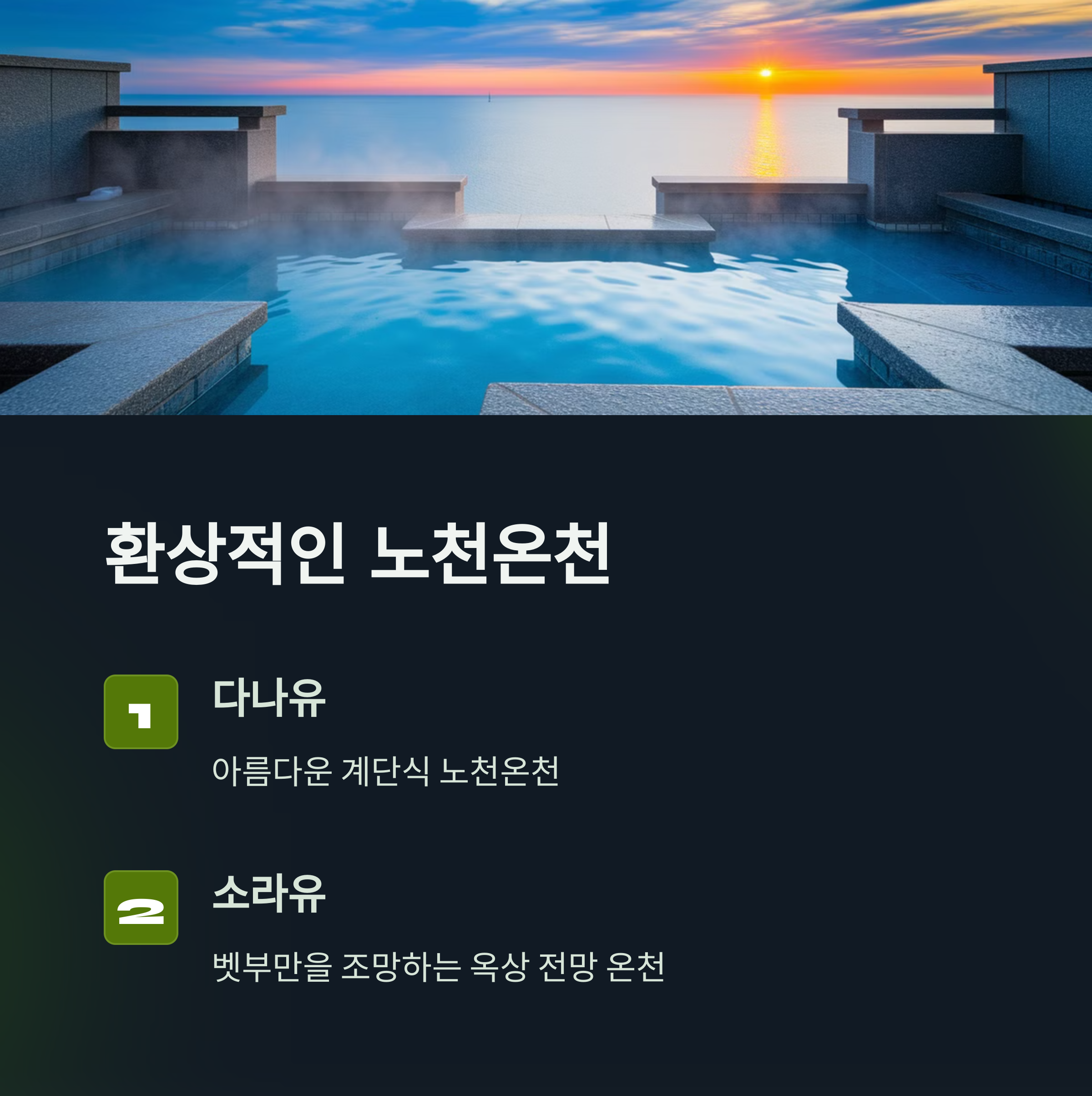 **소라유 노천온천**에서 벳부만과 시내 야경을 감상하는 것! 아침에는 일출과 함께 온천을 즐길 수 있어 더욱 특별한 경험이 됩니다. 또한, **다나유 온천**의 계단식 노천탕에서 벳부의 온천수를 제대로 즐겨보는 것도 필수 코스랍니다.