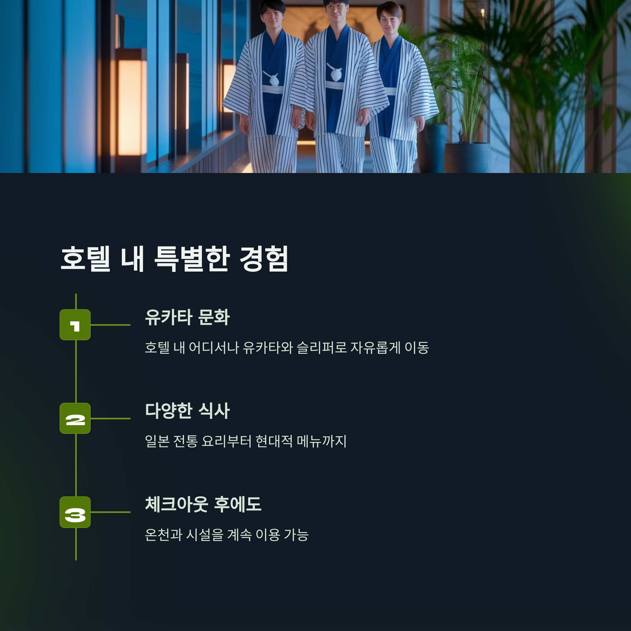 - **소라유**: 소라관 투숙객 전용 노천탕으로, 벳부시의 야경과 바다 전망을 감상할 수 있습니다. - **체크아웃 후에도 온천 이용 가능**: 객실카드나 영수증을 보여주면 체크아웃 후에도 아쿠아가든 및 온천 시설을 추가 이용할 수 있습니다. - **온천 후에는 유리병 우유 추천**: 탈의실 내 자판기에서 200엔 정도에 판매되는 유리병 우유를 마시면 더욱 개운합니다.
