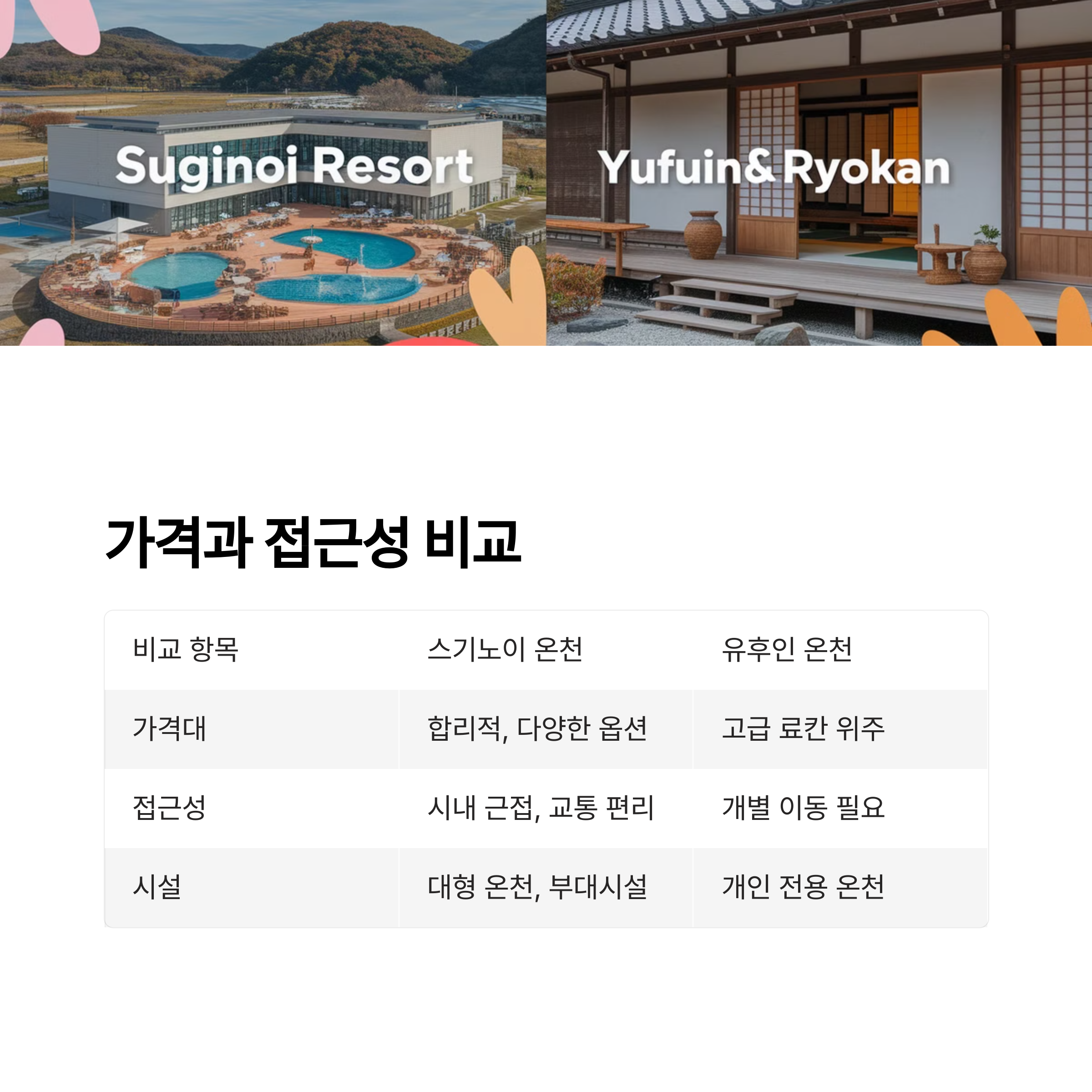 | 비교 항목 | 스기노이 온천 | 유후인 온천 |