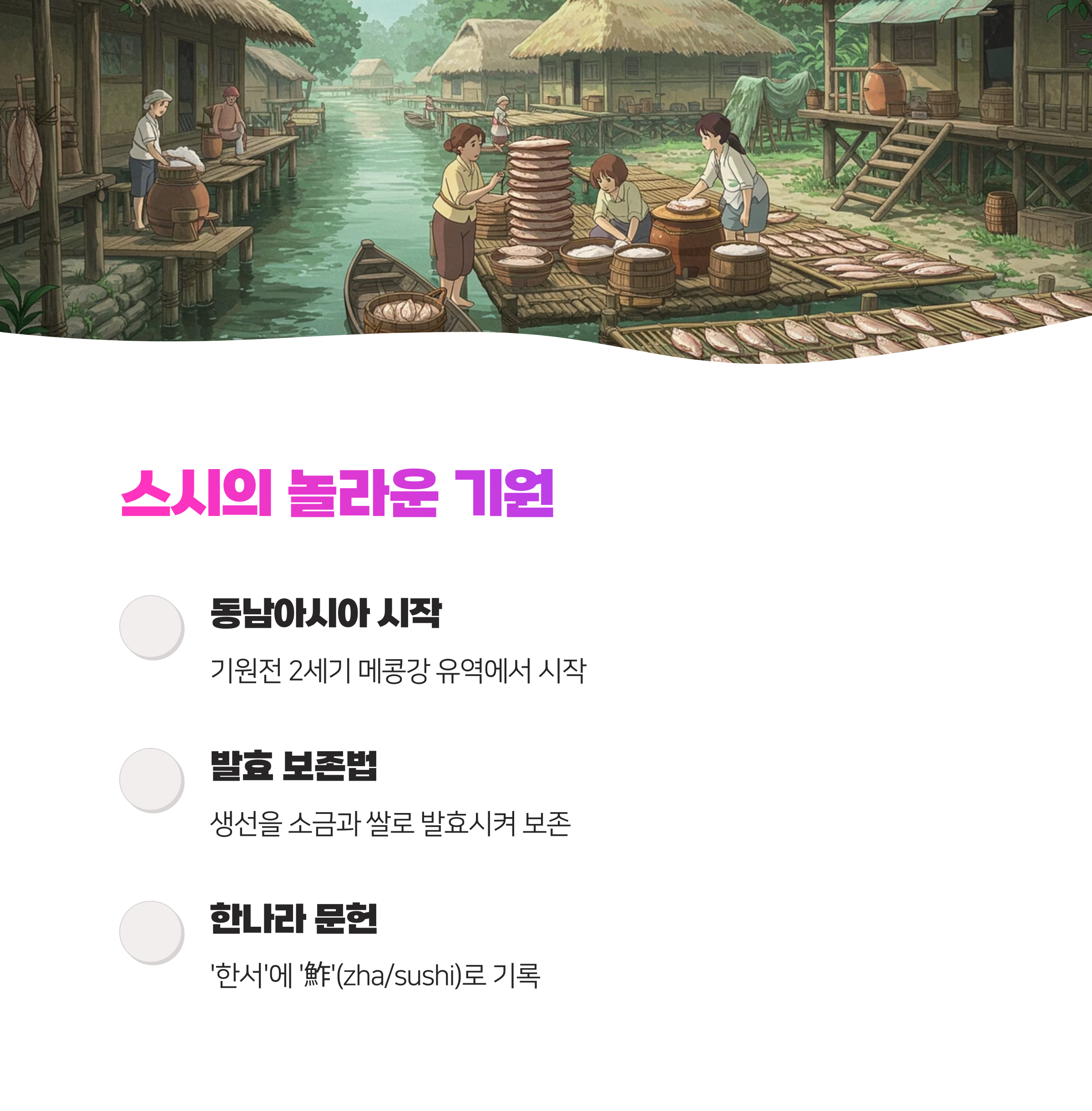 - 스시의 기원: 동남아 메콩강 → 중국 → 일본