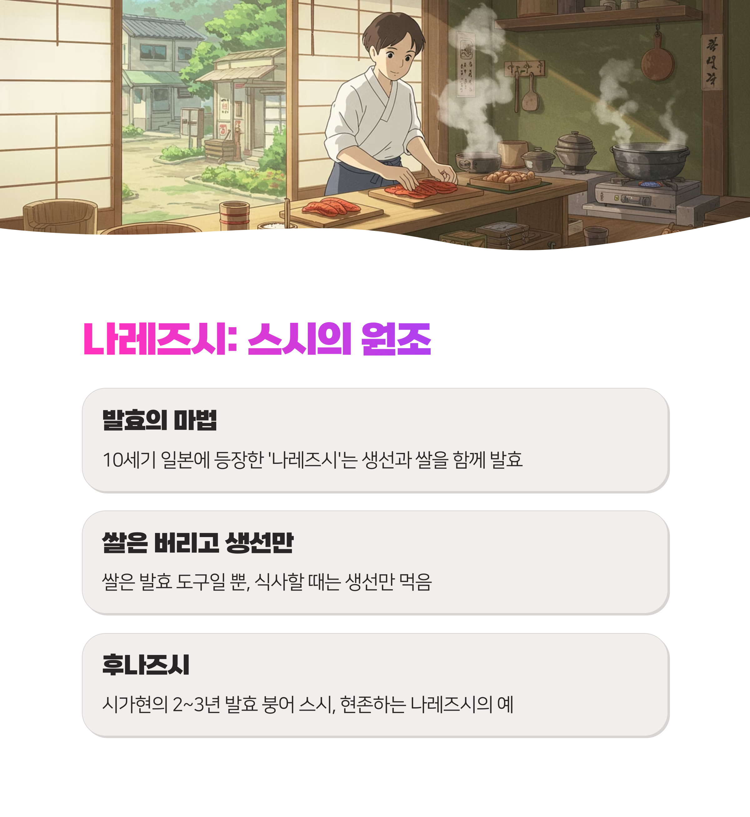- 대표 스시 형태: 나레즈시 → 나마나레즈시 → 하야스시 → 니기리스시