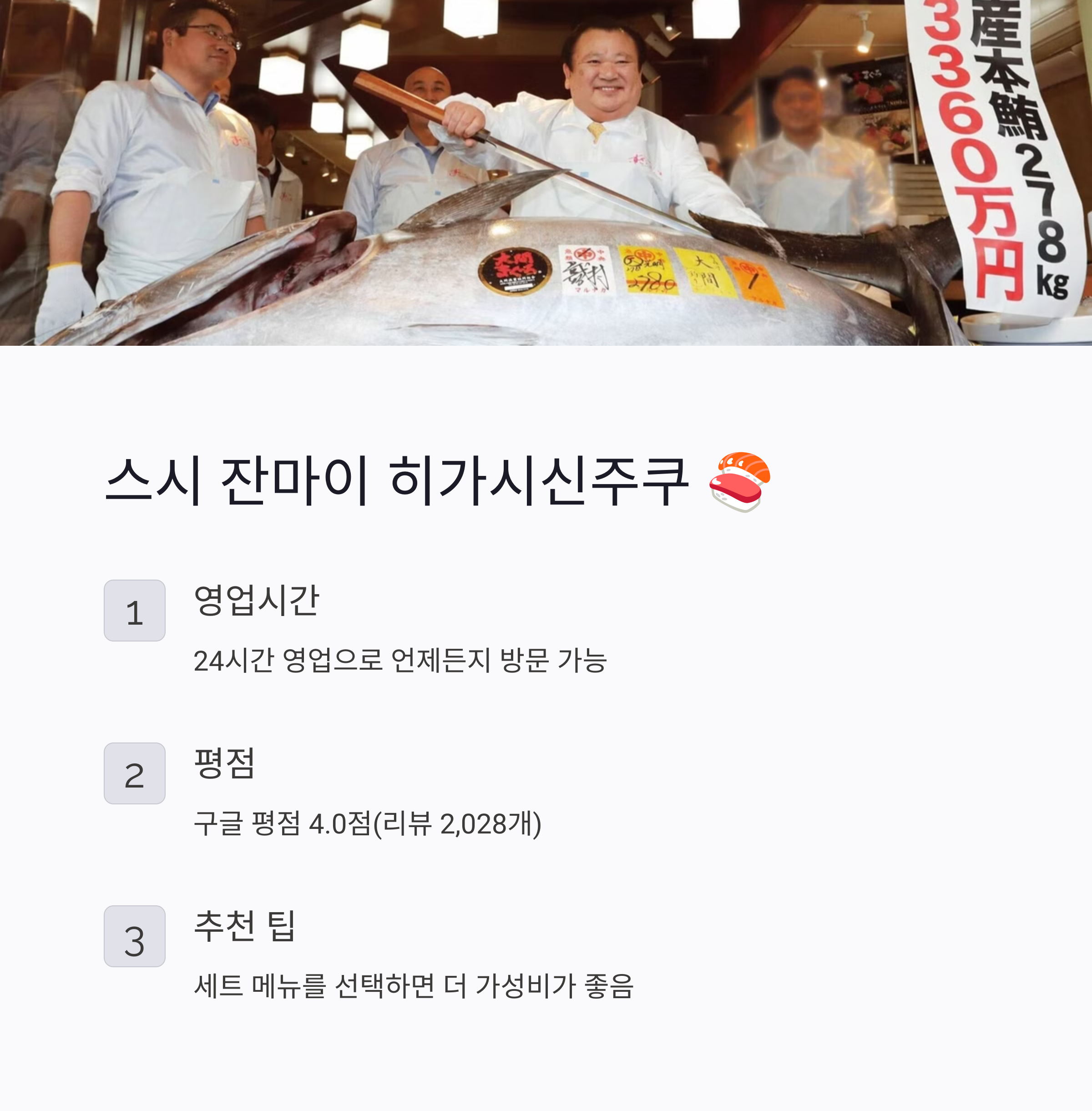 24시간 영업하는 가성비 좋은 초밥 체인점입니다. 구글 평점 4.0점(리뷰 2,028개)으로 많은 사람들이 찾는 곳입니다.
