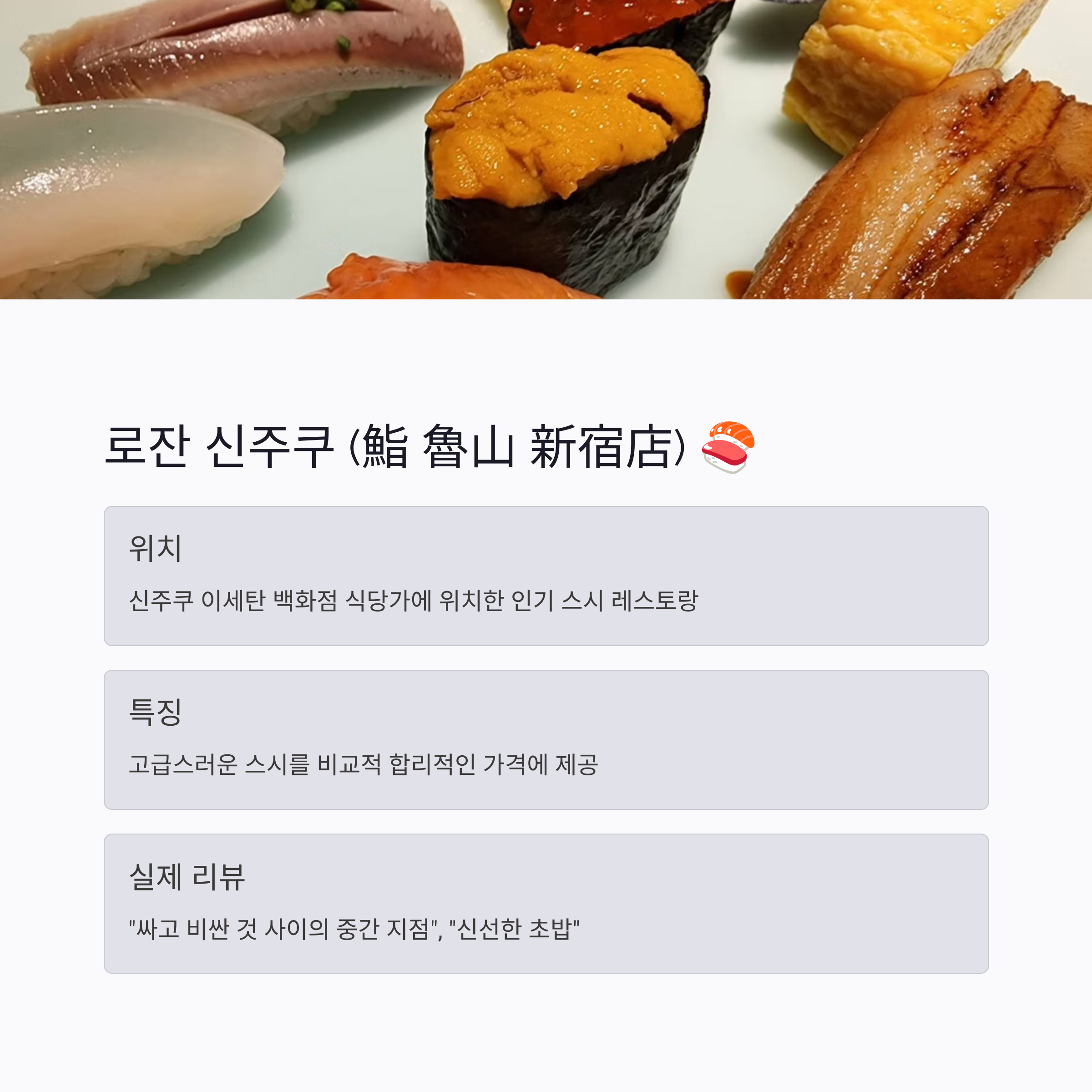 특징: 고급스러운 스시를 비교적 합리적인 가격에 즐길 수 있는 곳입니다.