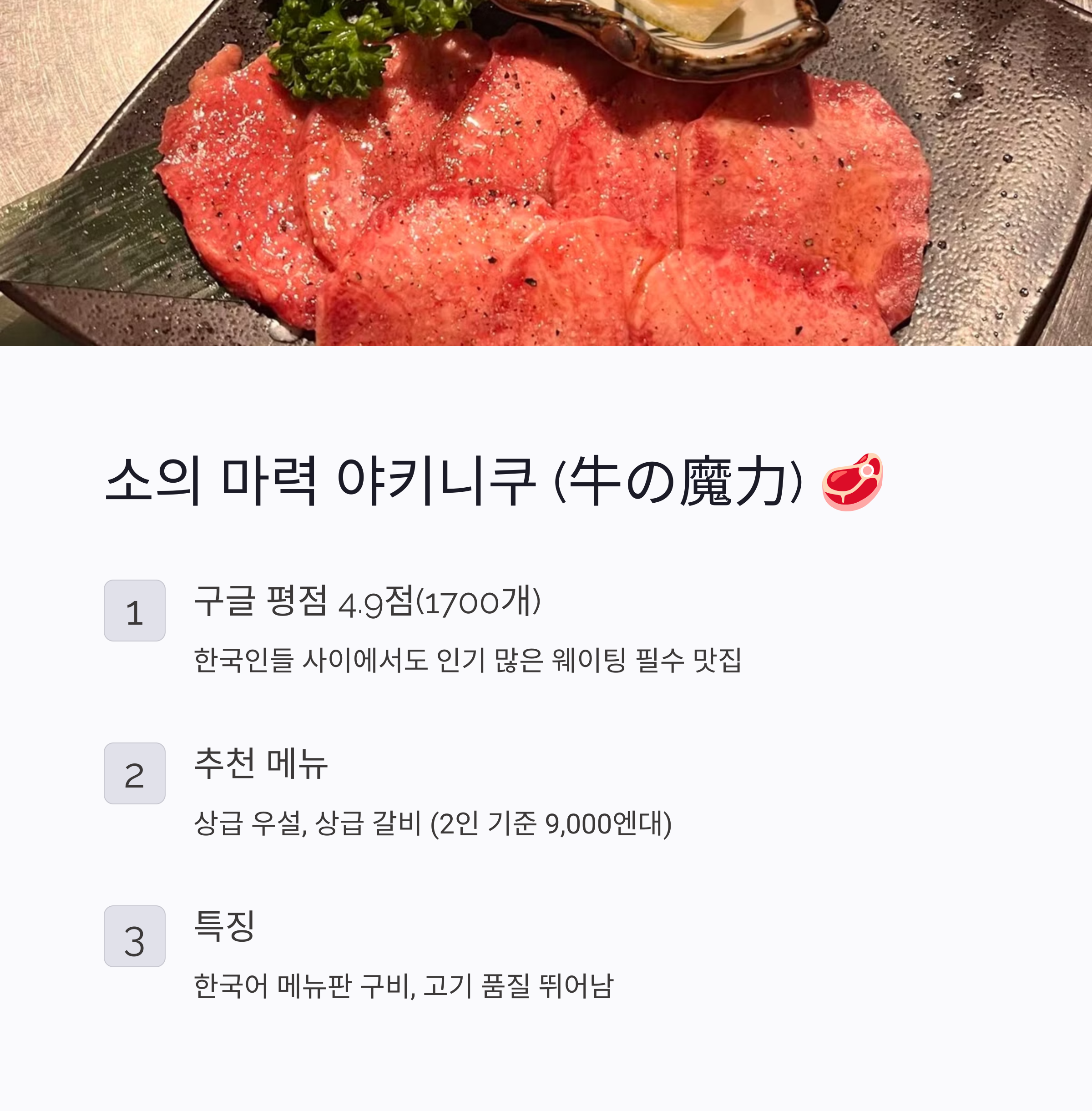 특징: 한국어 메뉴판이 준비되어 있어 주문이 편리하고, 고기 품질이 매우 뛰어납니다.