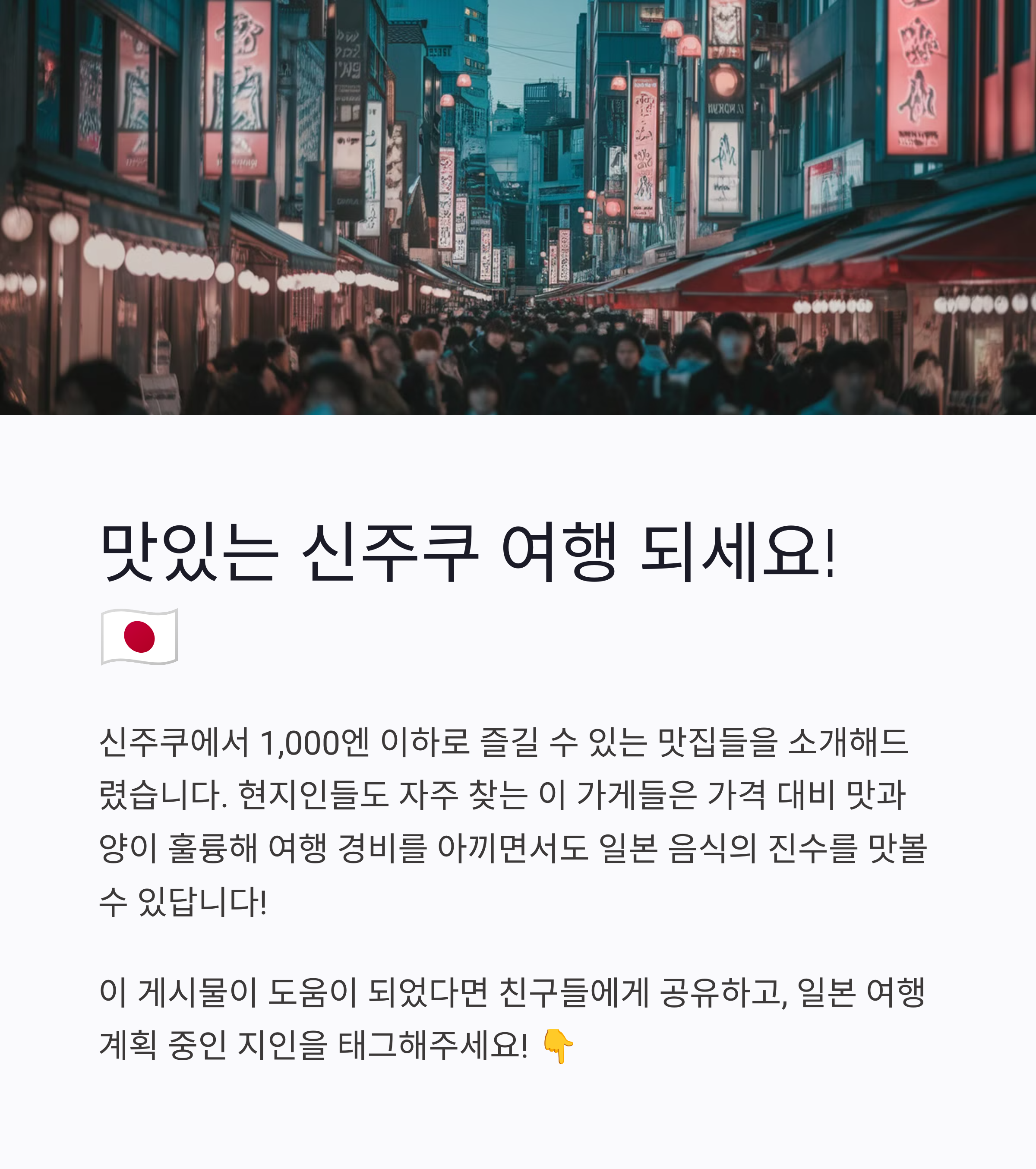신주쿠에서 가성비, 가심비로 즐길 수 있는 맛집들을 소개해드렸는데요, 어떠셨나요? 일본 여행 중에 맛있는 음식을 저렴하게 즐기고 싶다면 이 맛집들을 꼭 방문해보세요. 현지인들도 자주 찾는 이 가게들은 가격 대비 맛과 양이 훌륭해 여행 경비를 아끼면서도 일본 음식의 진수를 맛볼 수 있답니다! 여러분의 도쿄 여행이 맛있는 추억으로 가득하길 바랍니다. 😊