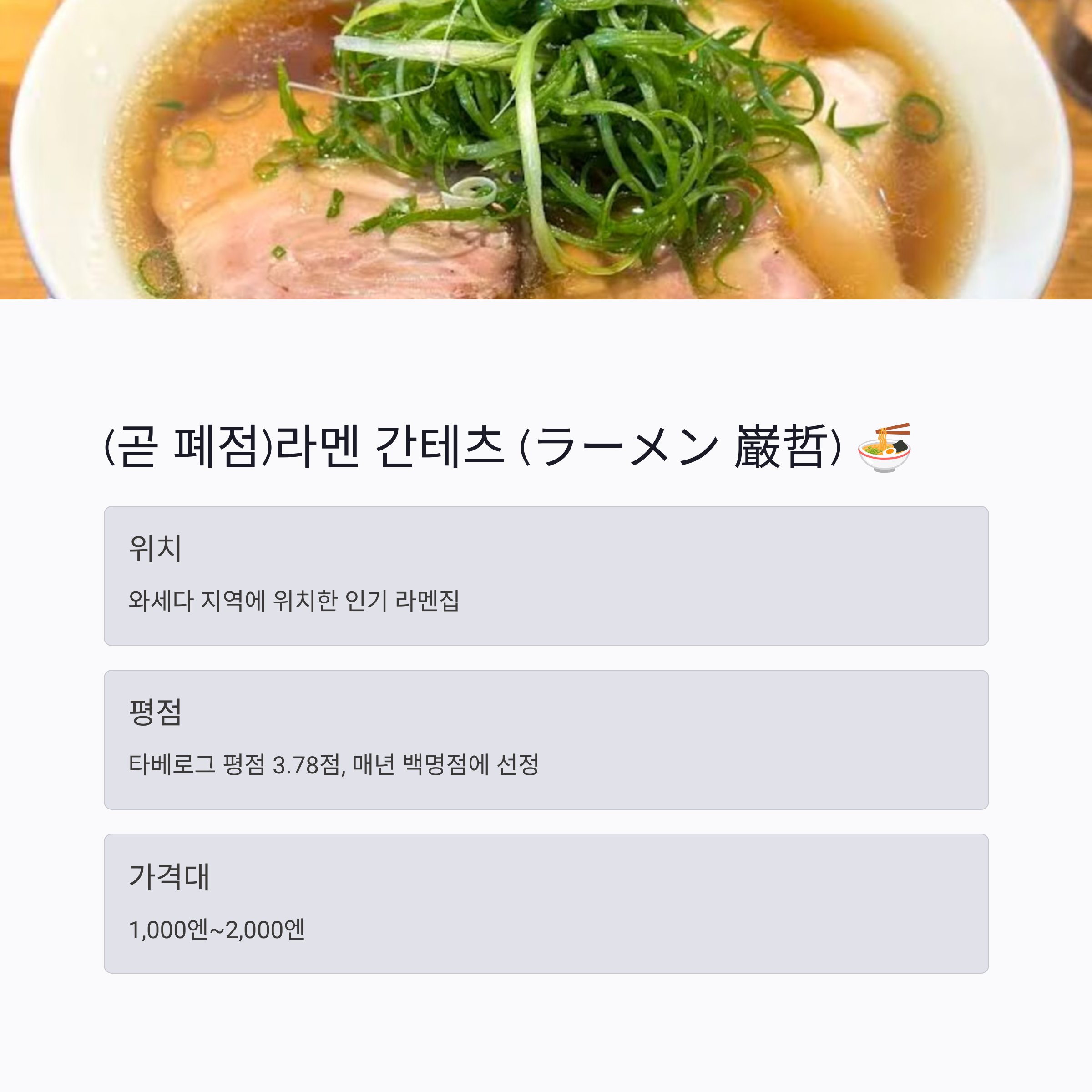 와세다 지역에 위치한 이 라멘집은 구글 평점 4.0점을 받고 있으며, 타베로그 백명점에 매년 선정되는 인기 라멘집입니다.