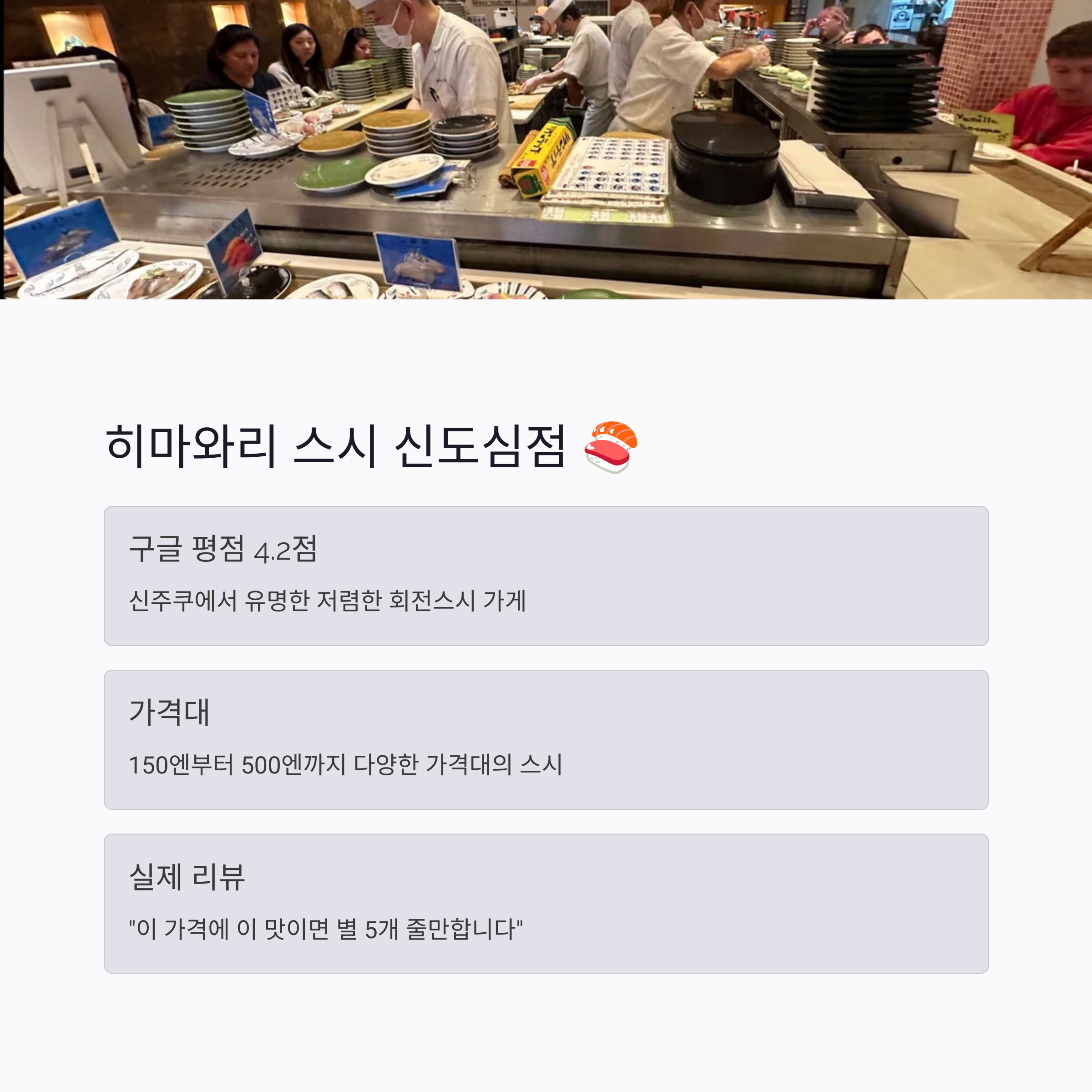 신주쿠 맛집들을 직접 방문해본 결과, 가격 대비 맛과 양이 정말 훌륭했어요. 특히 소의 마력 야키니쿠는 구글 평점 4.9점이 과언이 아닐 정도로 고기 품질이 뛰어났고, 한국어 메뉴판까지 있어서 편리했습니다. 히마와리 스시는 150엔이라는 가격이 믿기지 않을 정도로 신선한 재료를 사용해 맛이 좋았어요. 타츠노야의 곱창츠케멘은 처음 먹고도 여행 내내 생각나서 결국 한 번 더 먹고 올 정도로 맛있었습니다.