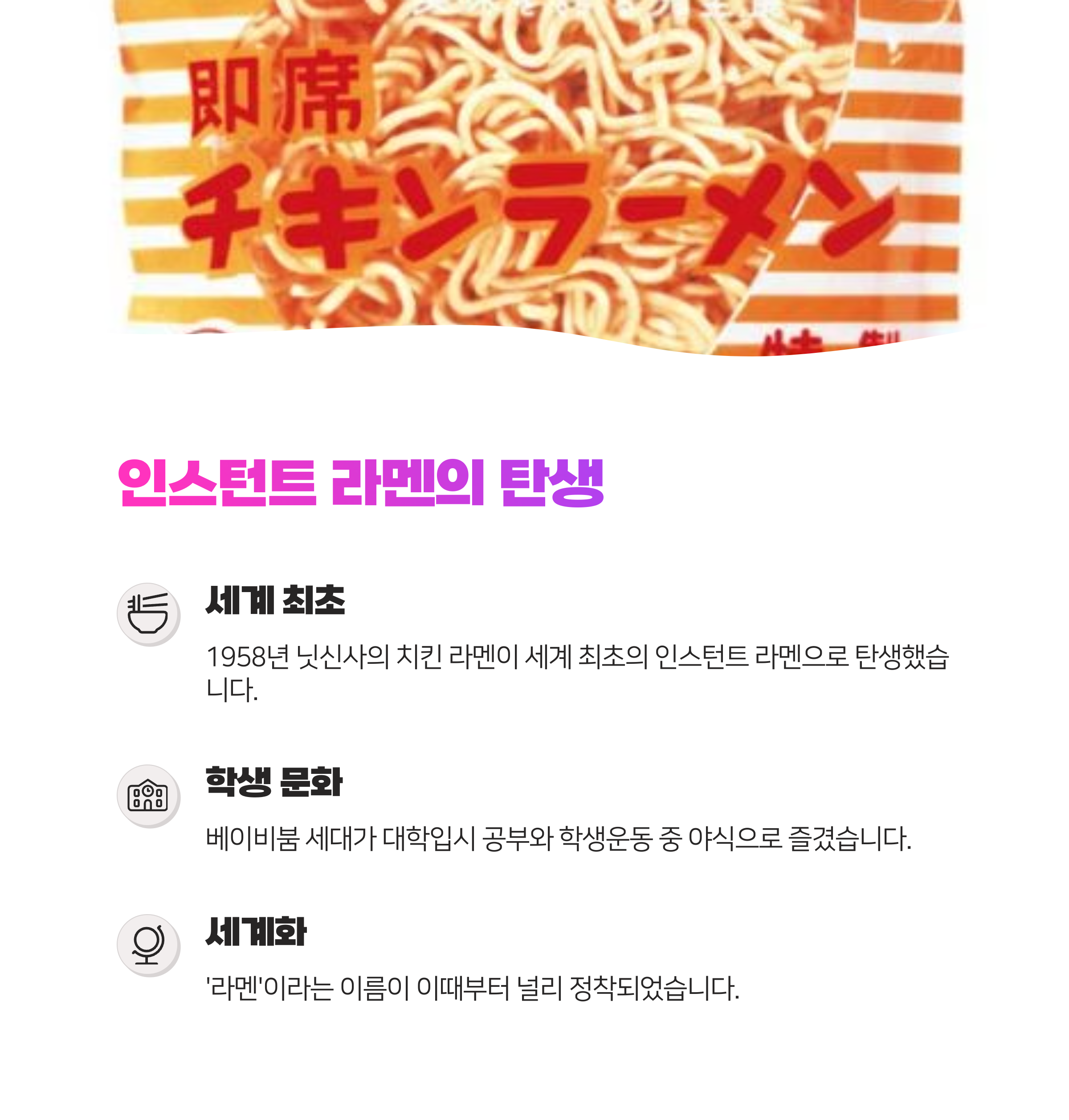 1958년 닛신의 ‘치킨 라멘’은 세계 최초의 인스턴트 라멘이었어요. 학생들의 야식, 청춘의 상징으로 자리잡으며 라멘은 전 국민의 간식이 되었죠. 이젠 전 세계 어디서든 즐길 수 있는 라멘 글로벌화의 시발점이랍니다!