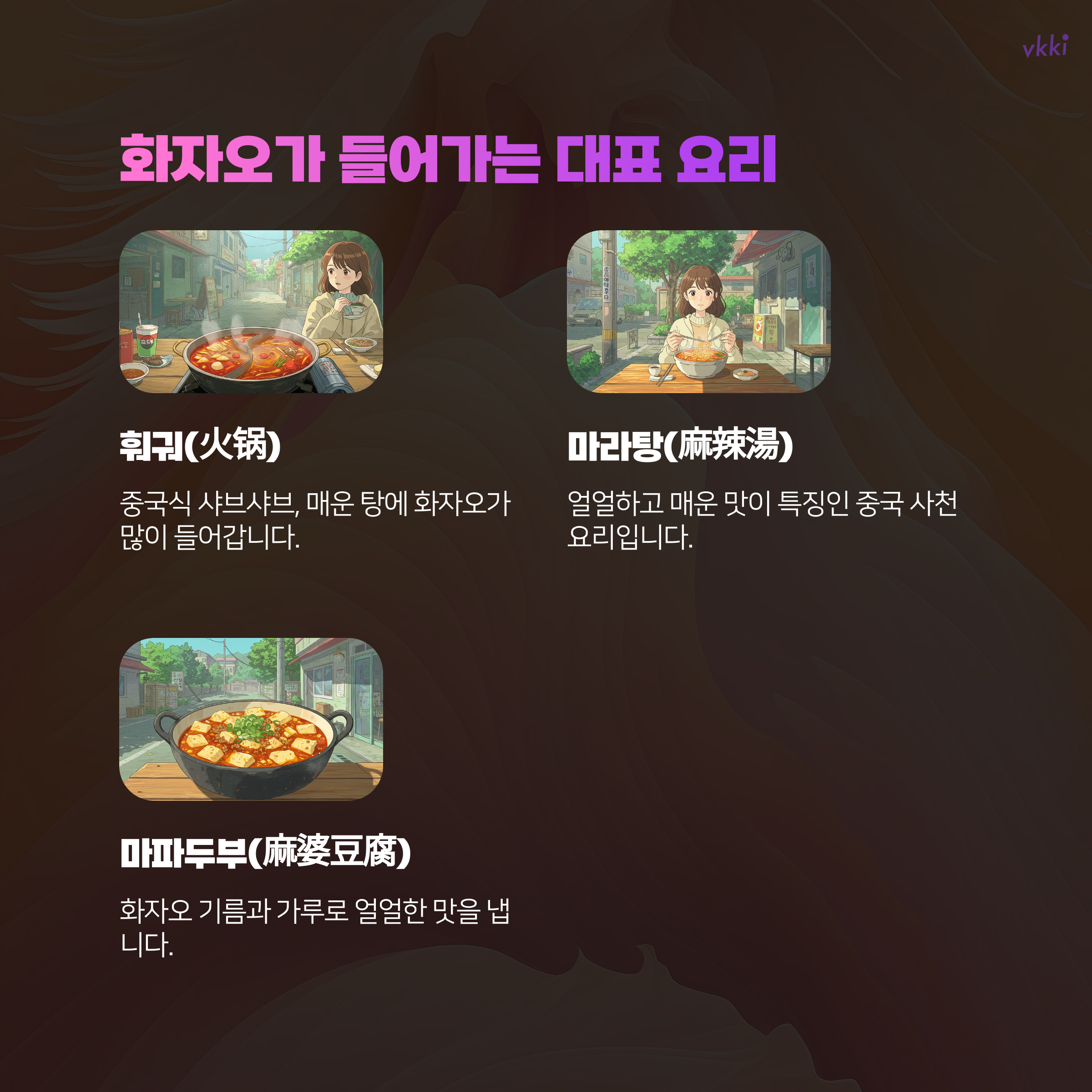 - 맛: 화자오 → 얼얼한 마비감 / 후추 → 톡 쏘는 매운맛