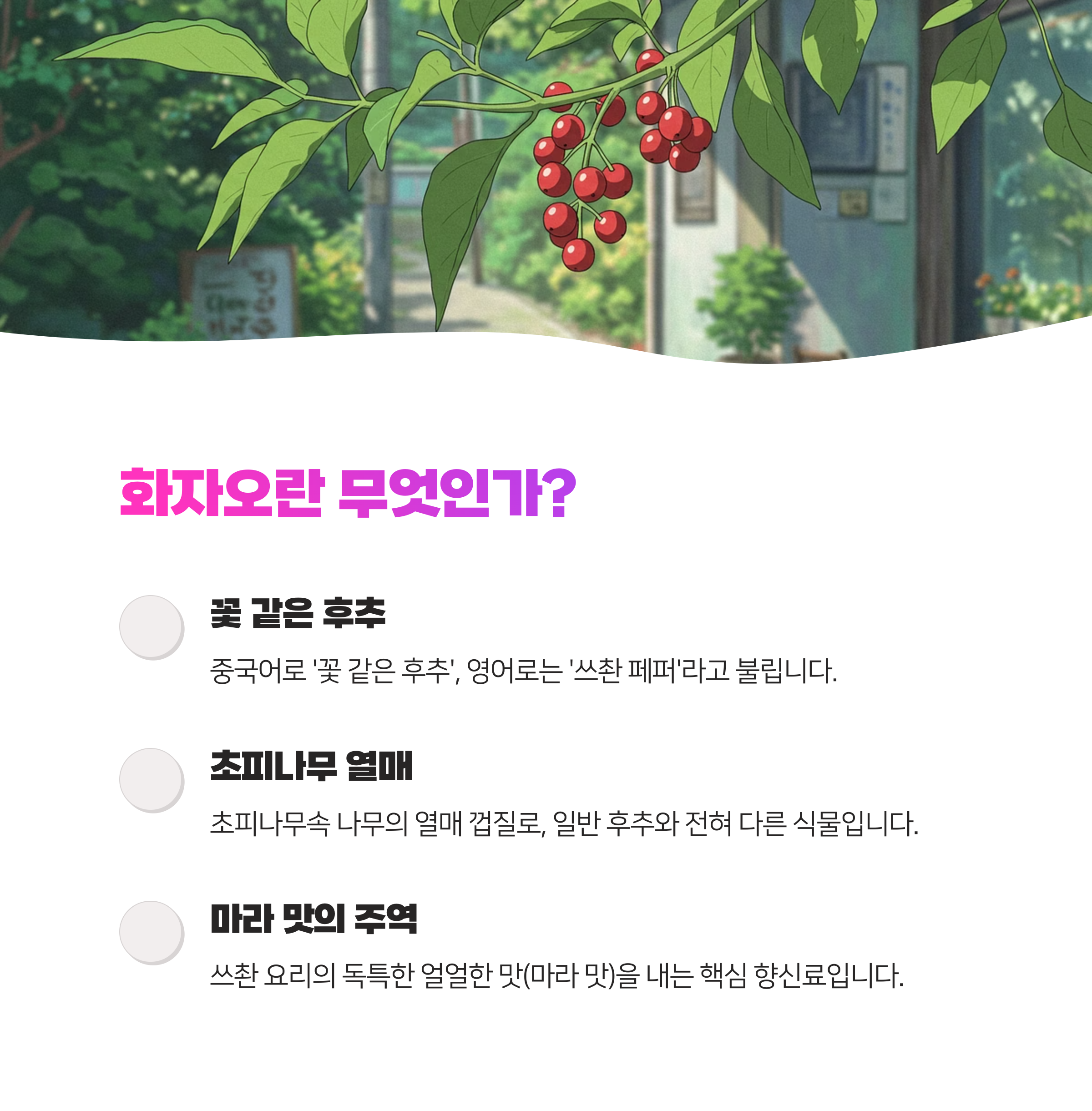 화자오(花椒)는 직역하면 '꽃 같은 후추'라는 뜻이지만, 우리가 아는 검은 후추와는 완전히 다른 존재예요.
