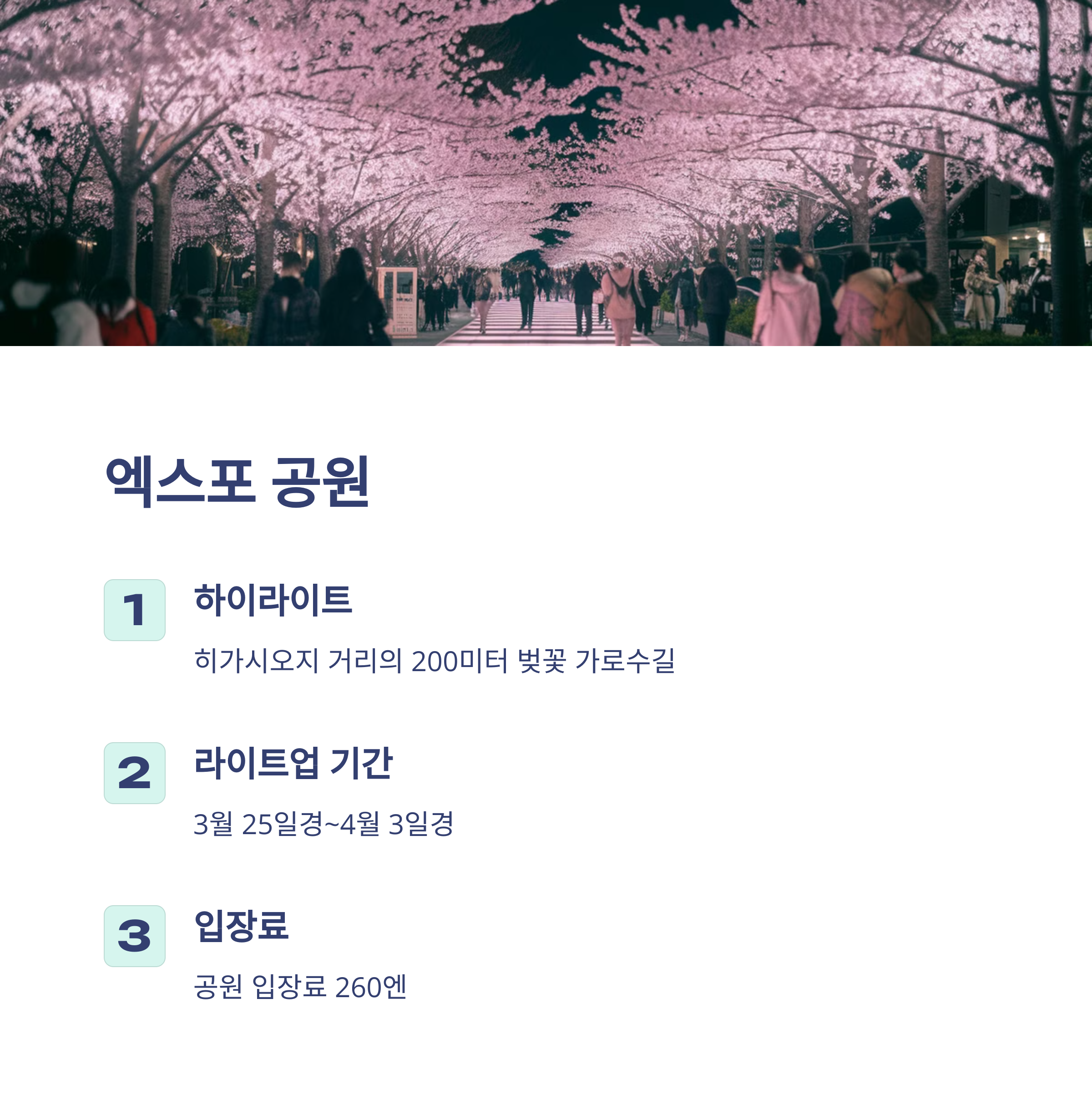 엑스포 공원은 벚꽃 시즌에 라이트업 이벤트로 유명해요. 특히 히가시오지 거리의 200미터 길이의 벚꽃 가로수길이 밤에 조명으로 빛나는 모습이 아름다워요.