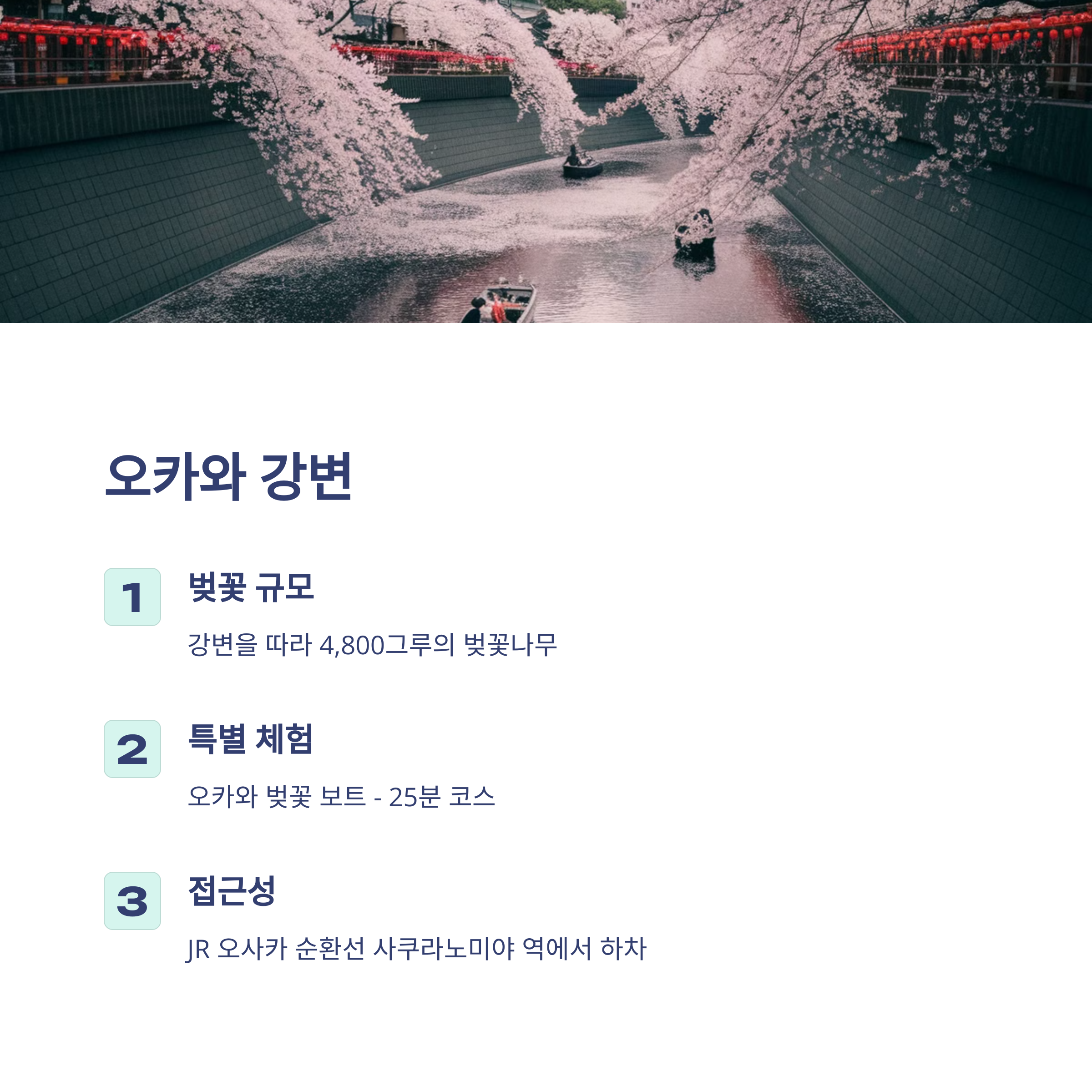오사카의 벚꽃은 매년 3월 말부터 4월 초까지 절정을 이루며, 공원과 강변, 성곽 주변 등 다양한 명소에서 화려한 벚꽃을 감상할 수 있어요. 2025년 봄, 오사카에서 아름다운 벚꽃과 함께 특별한 추억을 만들어 보세요! 🌸