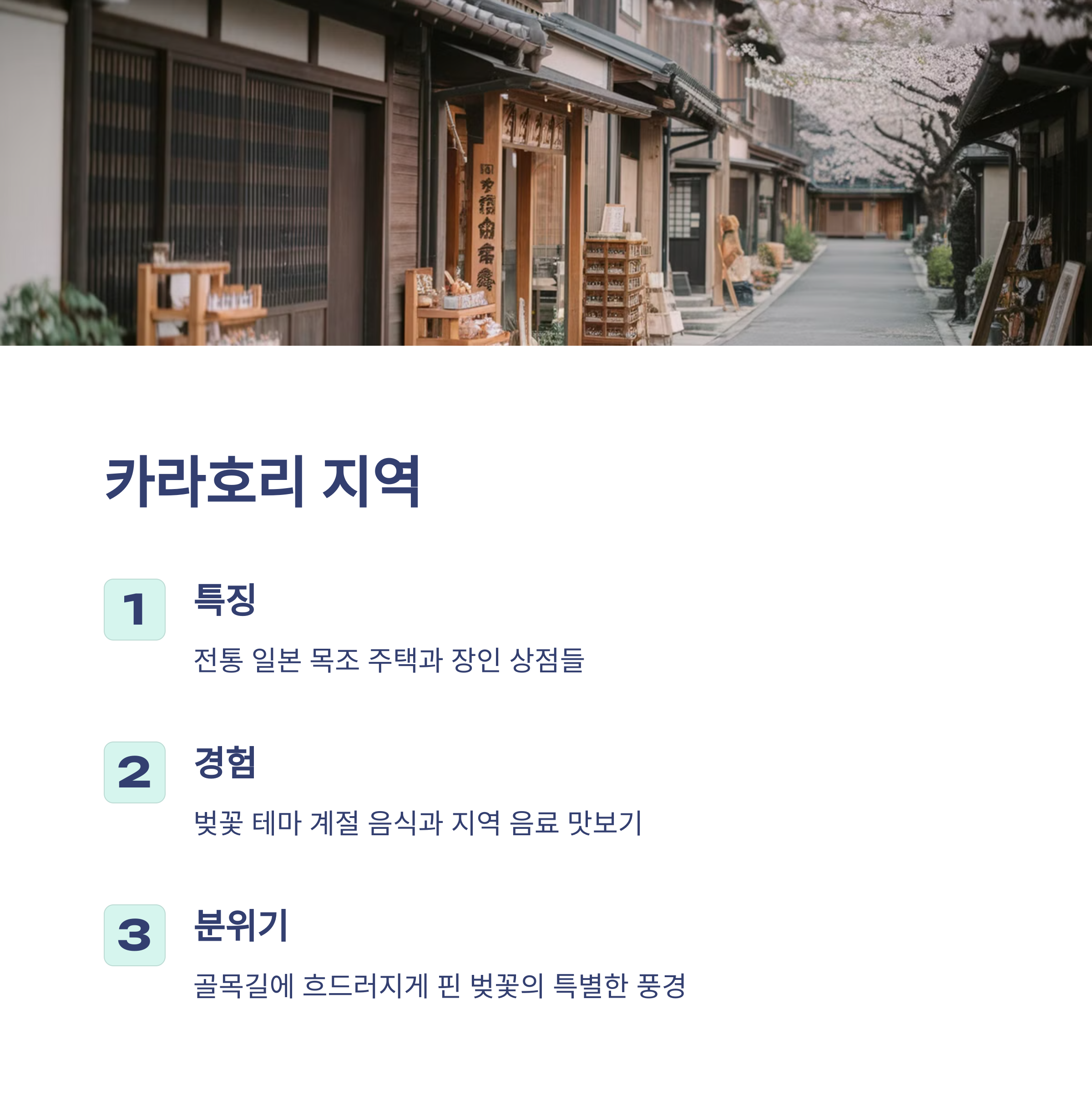 카라호리는 오사카의 숨겨진 보석 같은 곳으로, 전통적인 일본 목조 주택과 장인 상점들이 미로처럼 이어진 골목길에 벚꽃이 흐드러지게 피어 특별한 분위기를 자아내요.