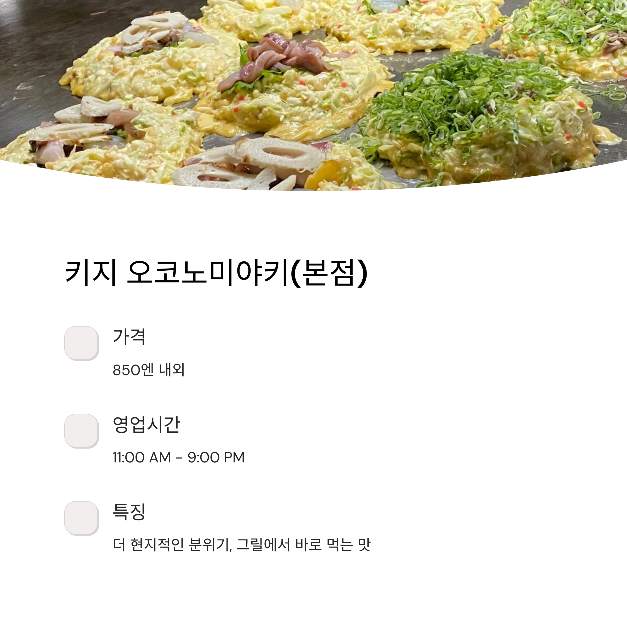 - "키지 오코노미야키 레스토랑이 좋았어요. 친구가 데려갔는데 정말 좋았어요. 진짜 오코노미야키를 맛보세요."