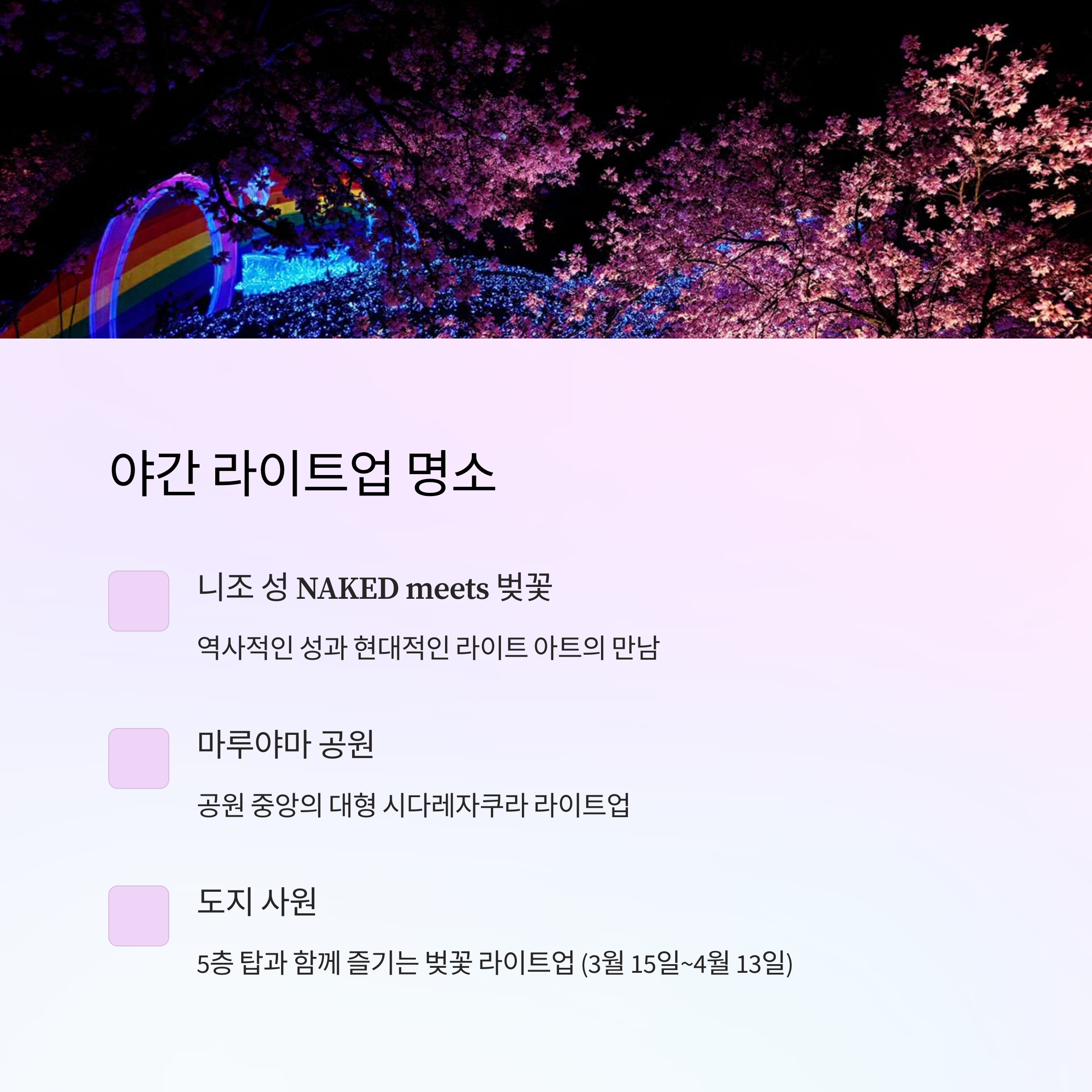 - 야간 촬영 시 삼각대를 사용하세요: 라이트업된 벚꽃을 선명하게 담을 수 있어요