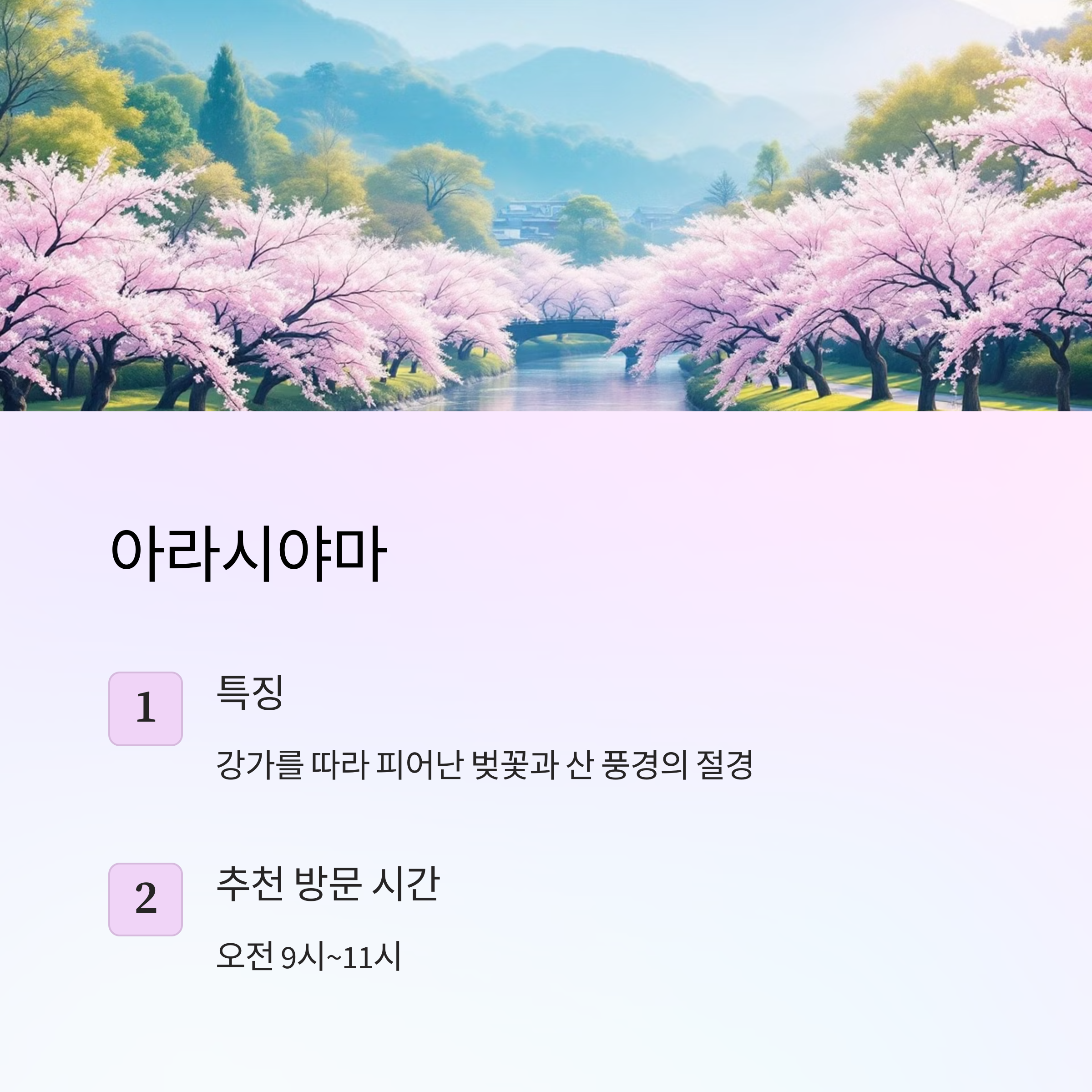 아라시야마는 강가를 따라 피어난 벚꽃과 산 풍경이 어우러진 절경을 감상할 수 있는 곳이에요. 특히 아침 시간대에 방문하면 맑은 공기와 함께 고요한 분위기 속에서 벚꽃을 즐길 수 있어요.