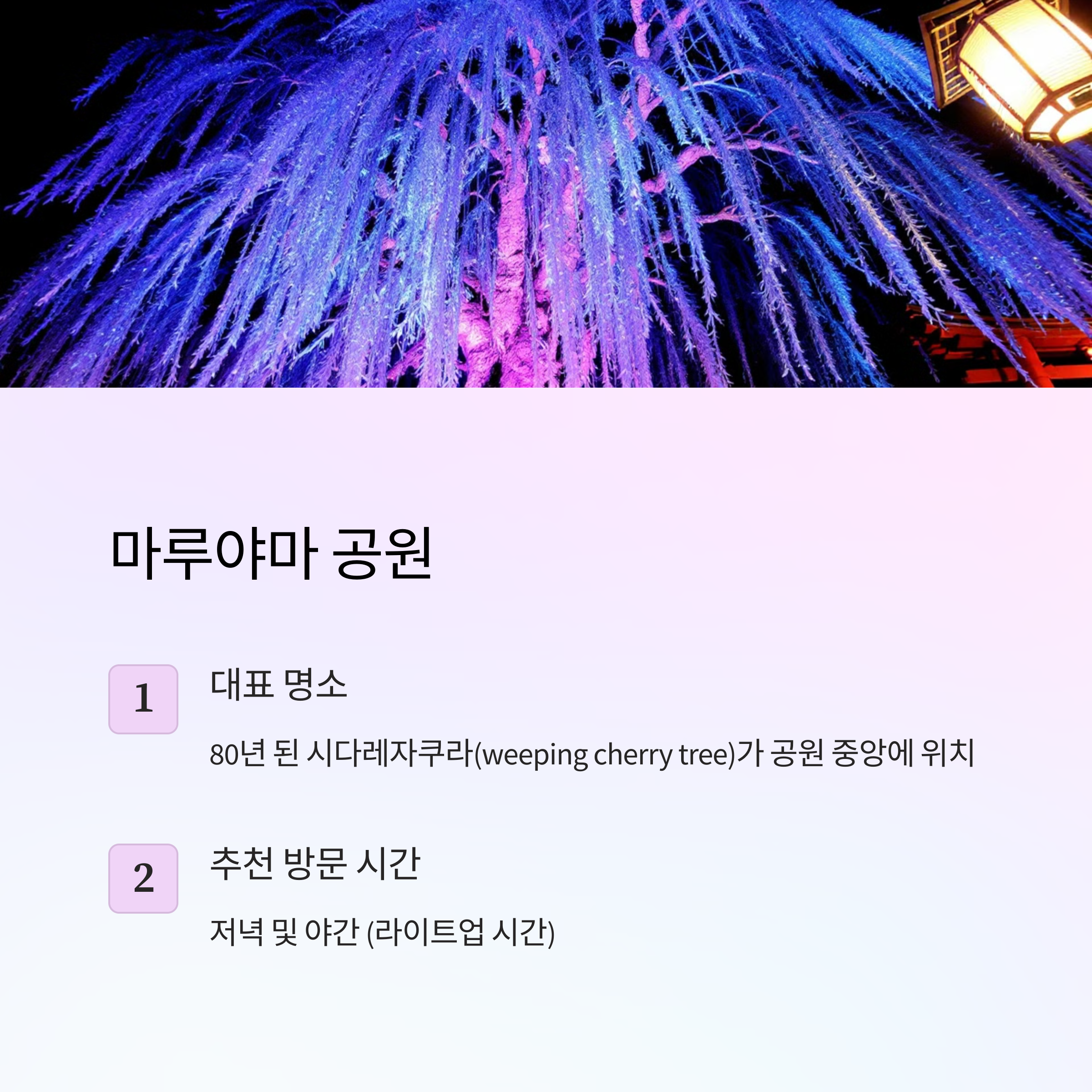 교토에서 가장 유명한 벚꽃 명소로 꼽히는 마루야마 공원은 **80년 된 시다레자쿠라(weeping cherry tree)**가 공원 중앙에 자리해 있어요. 특히 밤에는 라이트업이 되어 환상적인 분위기를 연출하죠. 야사카 신사와 가깝고 기온 지역의 중심부에 위치해 있어 접근성도 좋아요.