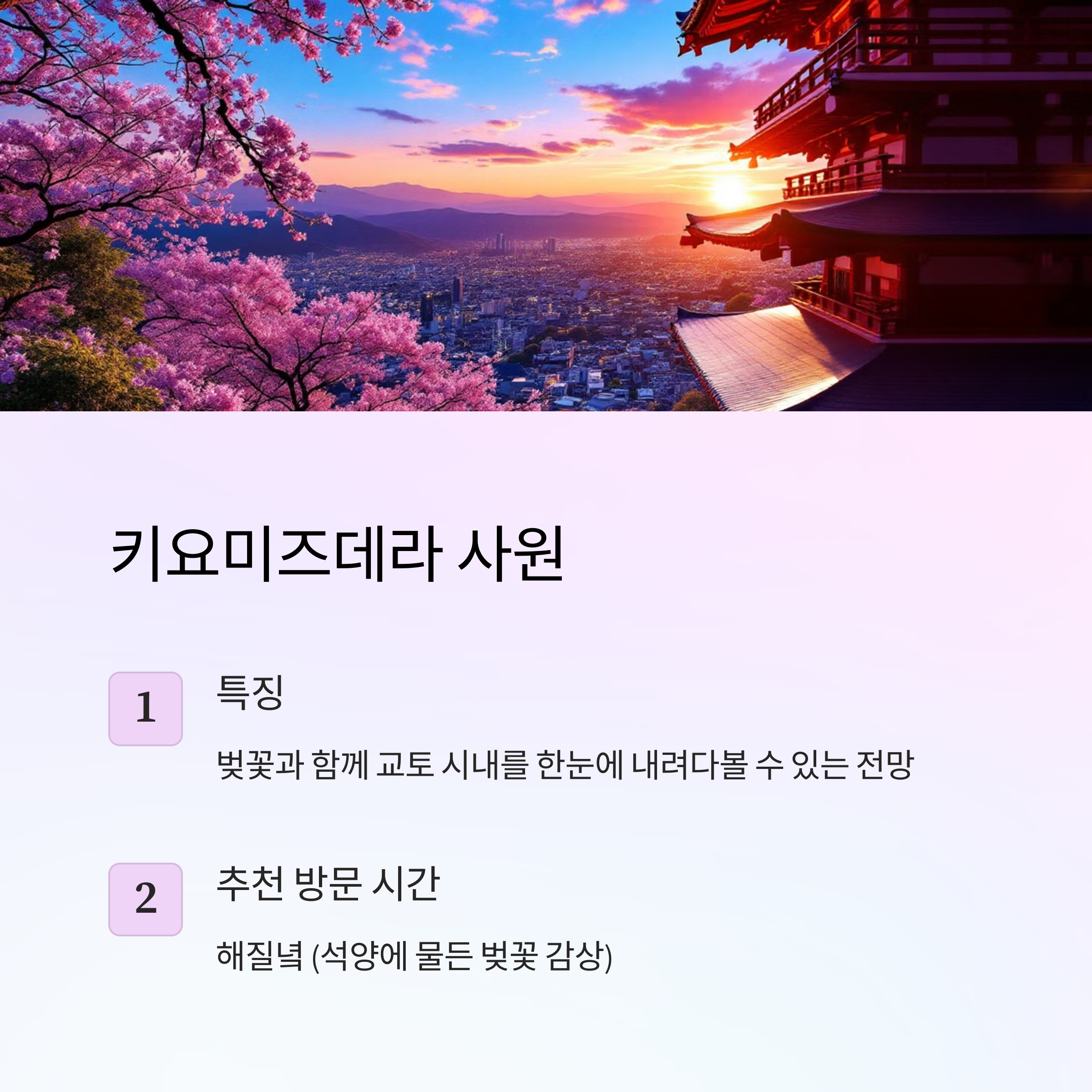 히가시야마 지역에 위치한 키요미즈데라 사원은 벚꽃과 함께 교토 시내를 한눈에 내려다볼 수 있는 전망이 일품이에요. 특히 해질녘에 방문하면 석양에 물든 벚꽃의 아름다움을 감상할 수 있어요.