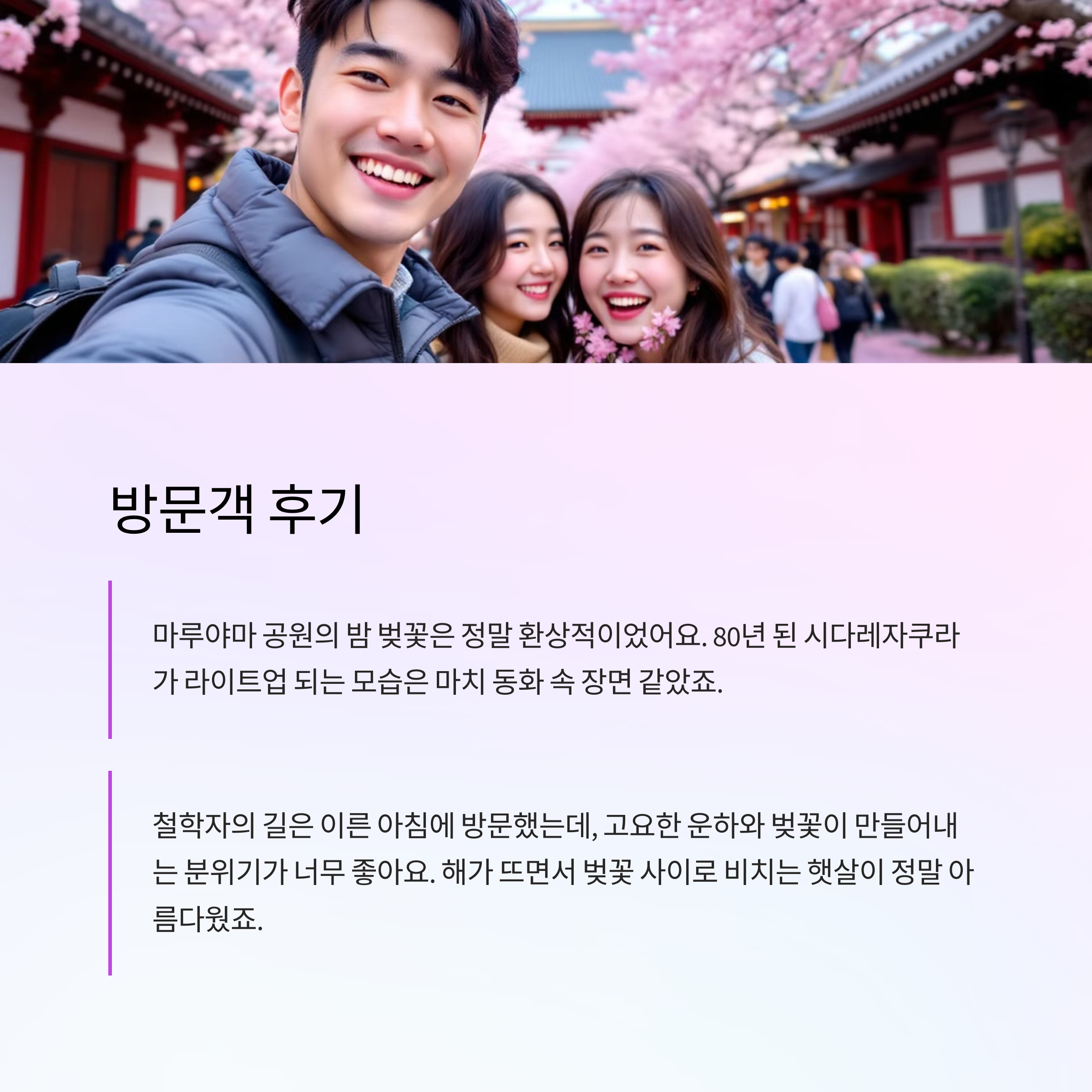 "마루야마 공원의 밤 벚꽃은 정말 환상적이었어요. 80년 된 시다레자쿠라가 라이트업 되는 모습은 마치 동화 속 장면 같았죠. 특히 평일 저녁에 방문했더니 사람들이 생각보다 적어서 여유롭게 감상할 수 있었어요."