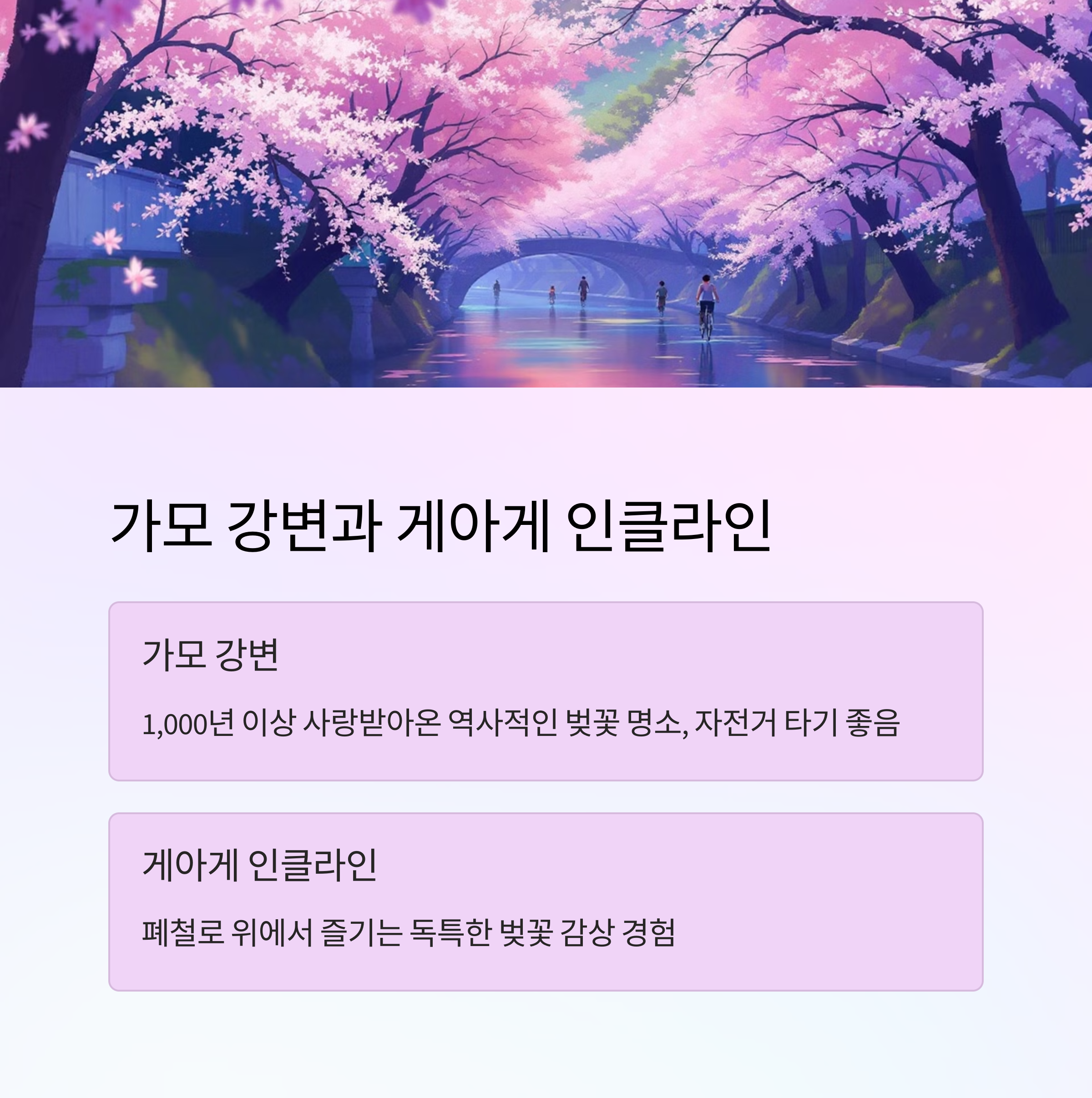 교토의 중심부를 흐르는 가모 강변은 1,000년 이상 벚꽃이 사랑받아온 역사적인 장소예요. 강변을 따라 자전거 도로가 있어 자전거를 타고 벚꽃을 감상하는 것도 좋은 경험이 될 거예요.