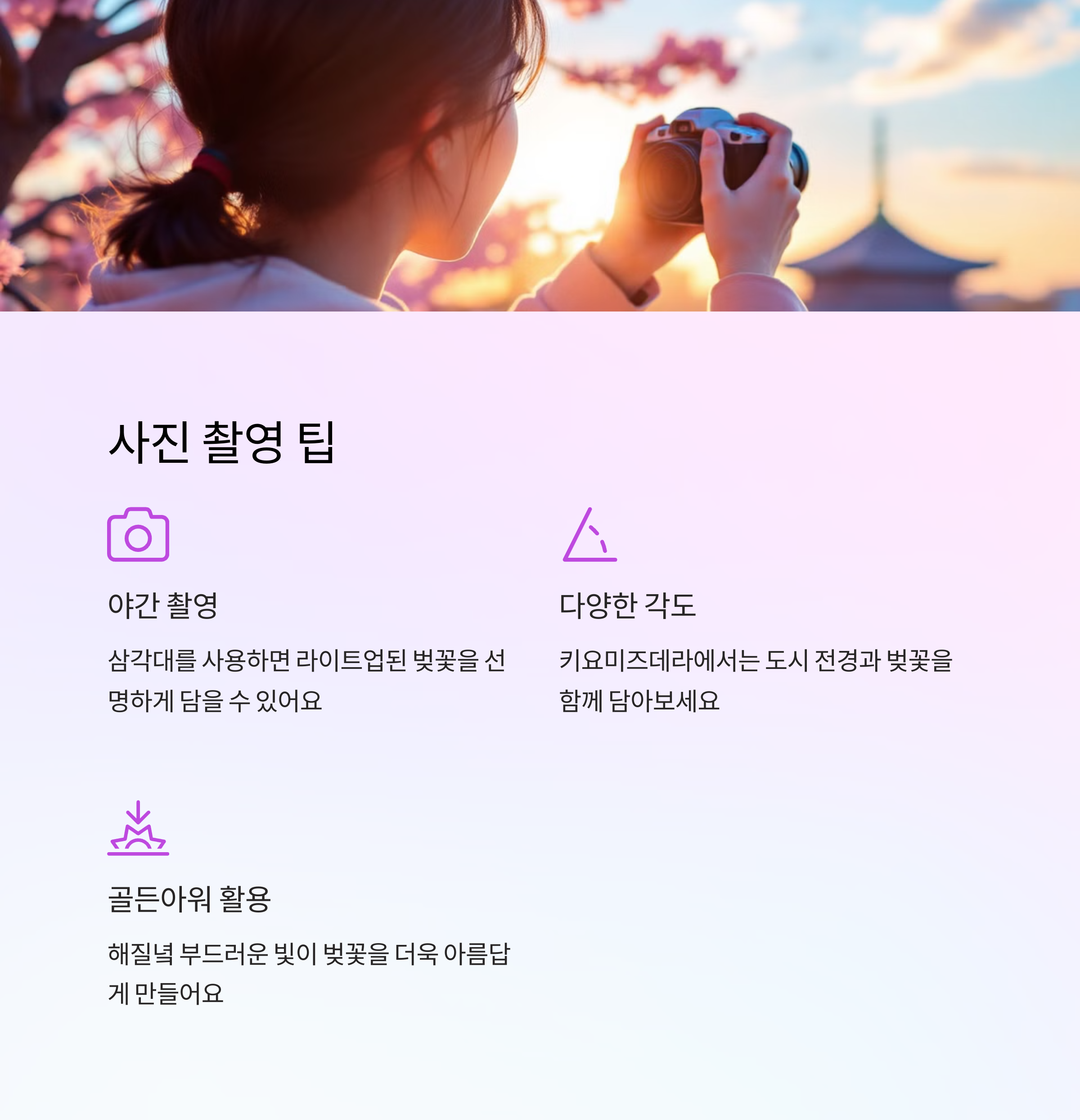• 골든아워(해질녘)를 활용하세요: 부드러운 빛이 벚꽃을 더욱 아름답게 만들어요
