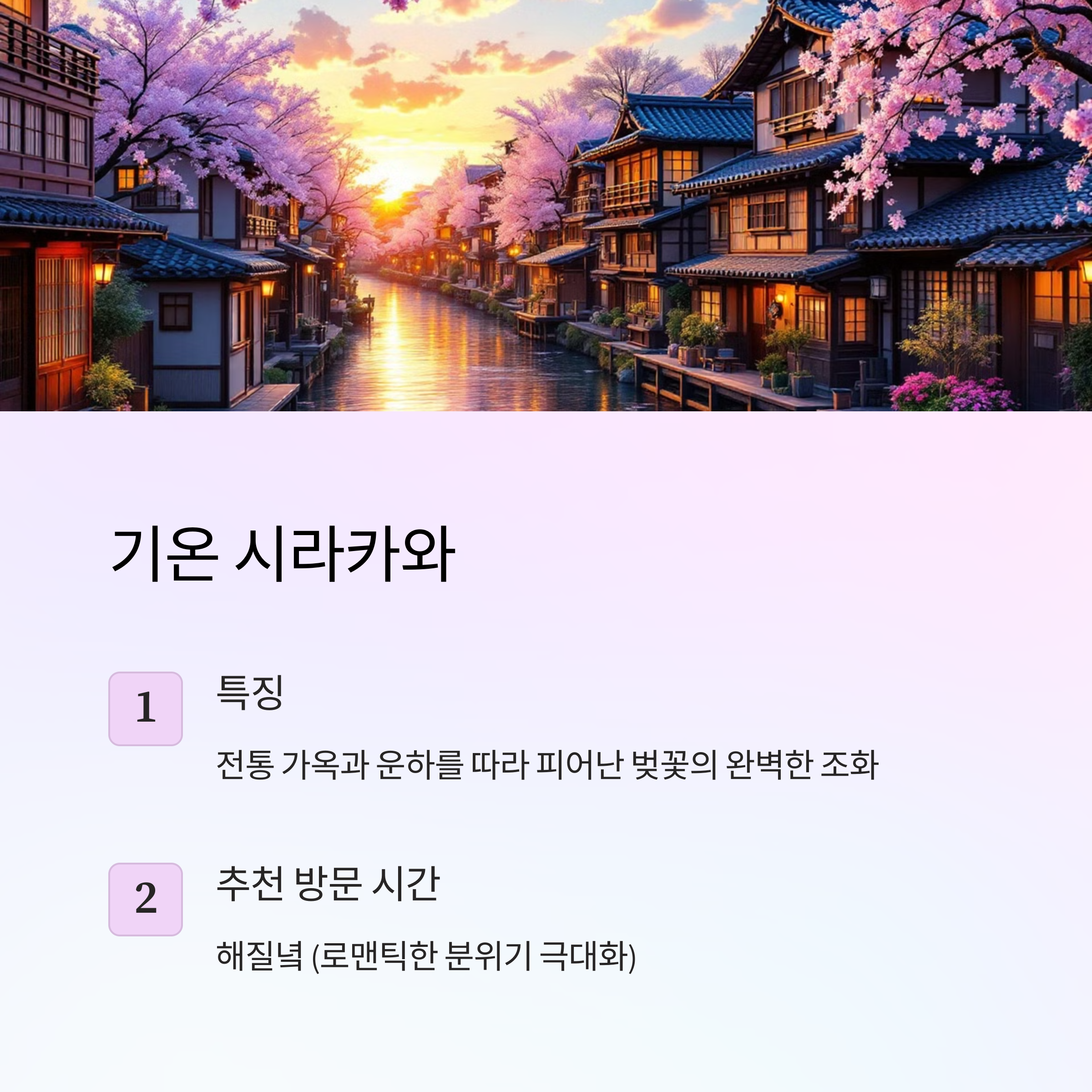 - 기온 시라카와: 전통 가옥과 운하를 따라 라이트업된 벚꽃
