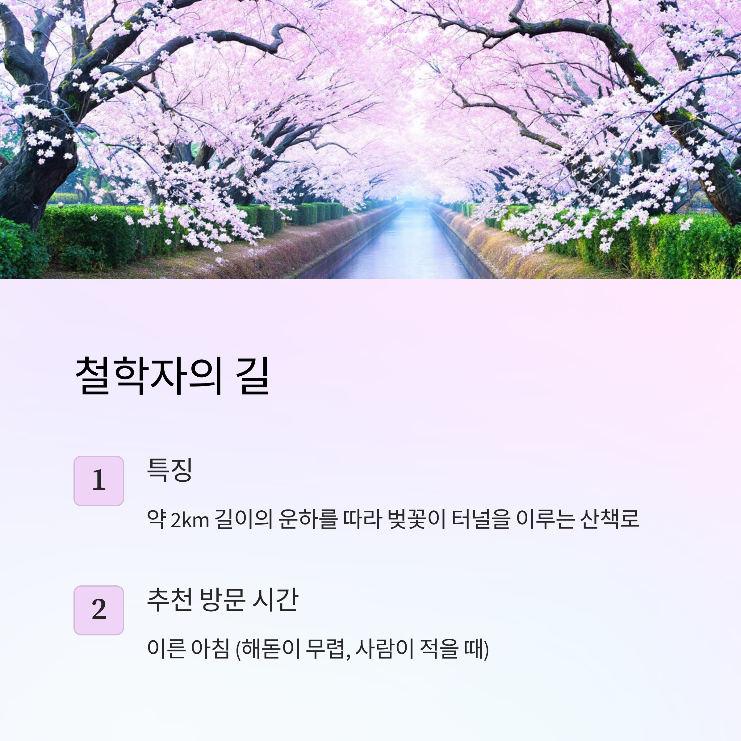 "철학자의 길은 이른 아침에 방문했는데, 고요한 운하와 벚꽃이 만들어내는 분위기가 너무 좋았어요. 해가 뜨면서 벚꽃 사이로 비치는 햇살이 정말 아름다웠죠. 다만 오전 9시 이후부터는 관광객들이 급격히 늘어나니 정말 일찍 가는 것을 추천해요!"