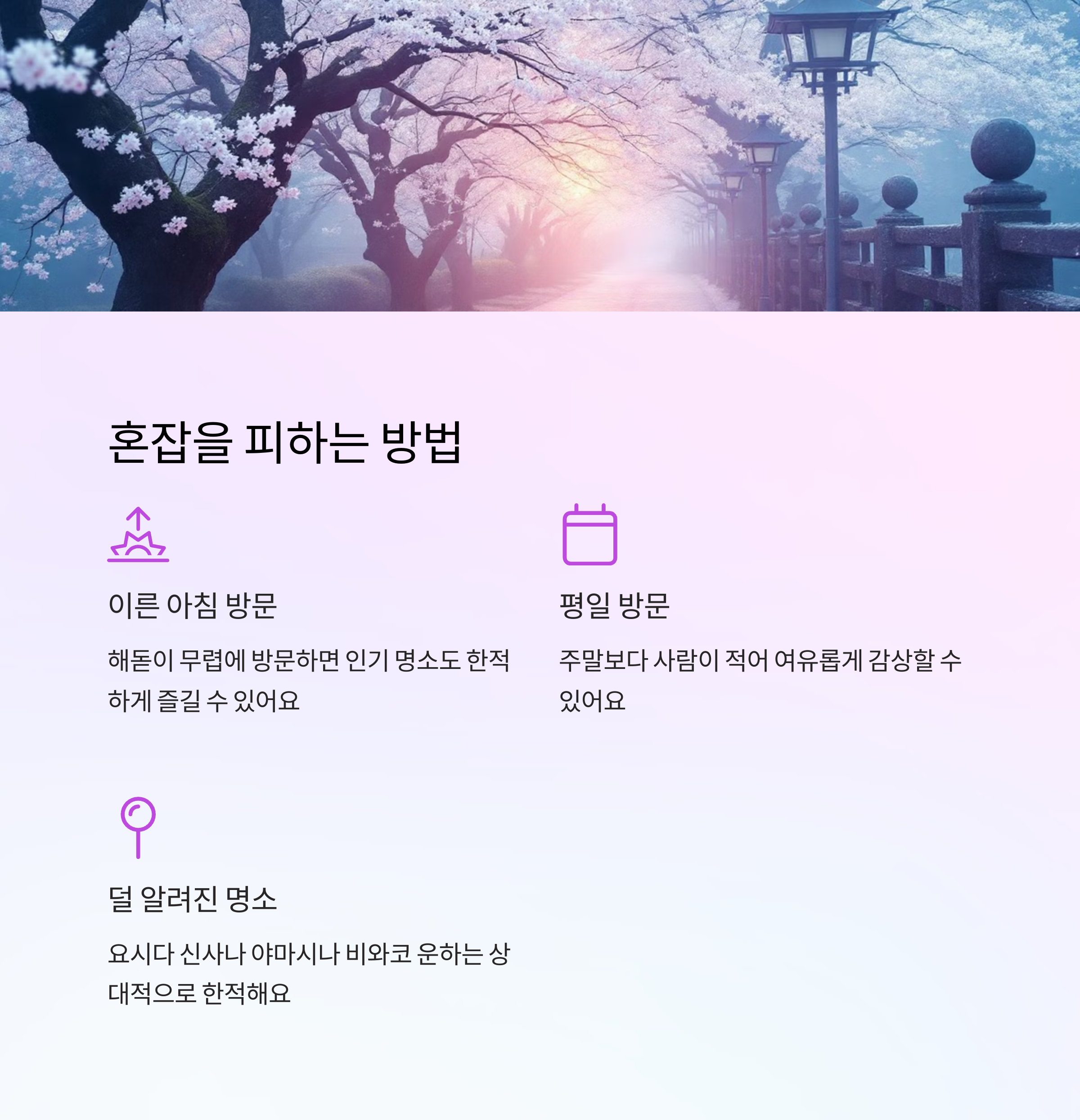 - 대중교통 이용하기: 교토는 대중교통이 잘 발달되어 있어요. 특히 벚꽃 시즌에는 혼잡할 수 있으니 일찍 이동하는 것이 좋아요