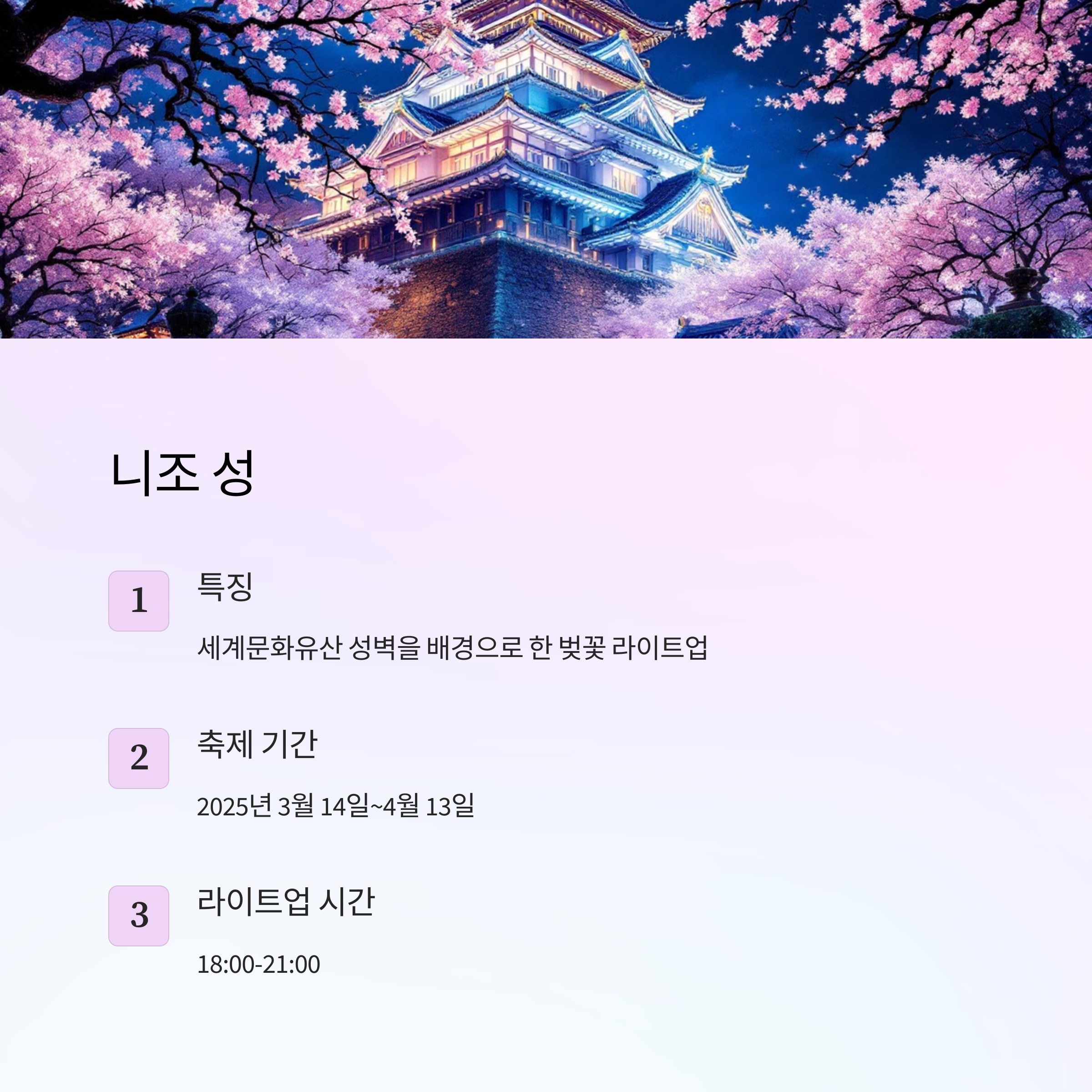 세계문화유산인 니조 성은 역사적인 성벽을 배경으로 한 벚꽃이 아름답게 라이트업되는 곳이에요. 2025년 3월 14일부터 4월 13일까지 벚꽃 축제가 열릴 예정이며, 야간 라이트업도 진행된다고 해요.