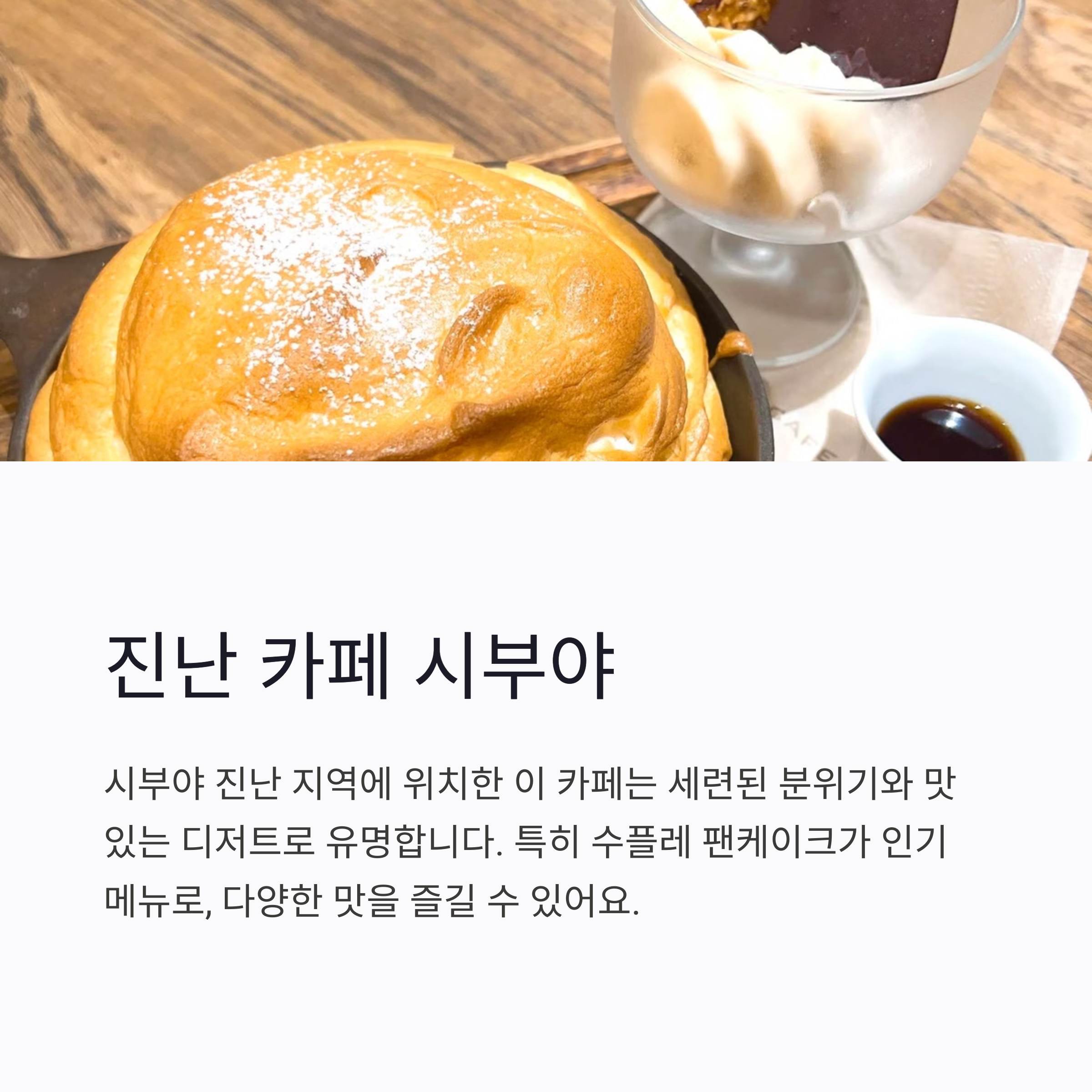 실사용 후기: "수플레 팬케이크가 정말 폭신폭신하고 맛있었어요! 특히 호지차 맛이 은은하고 달콤해서 좋았습니다. 테라스 자리는 반려동물도 함께할 수 있어서 더 좋았어요."