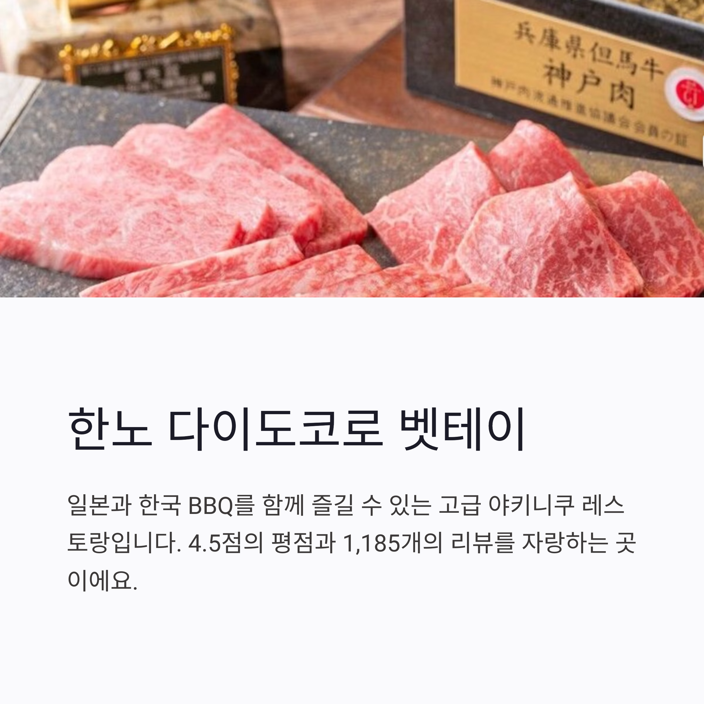 일본과 한국 BBQ를 함께 즐길 수 있는 고급 야키니쿠 레스토랑이에요. 10,000엔 이상의 가격대로 고급스러운 식사를 원하신다면 이곳을 추천해요. 4.5점의 평점과 1,185개의 리뷰를 자랑하는 곳이죠.