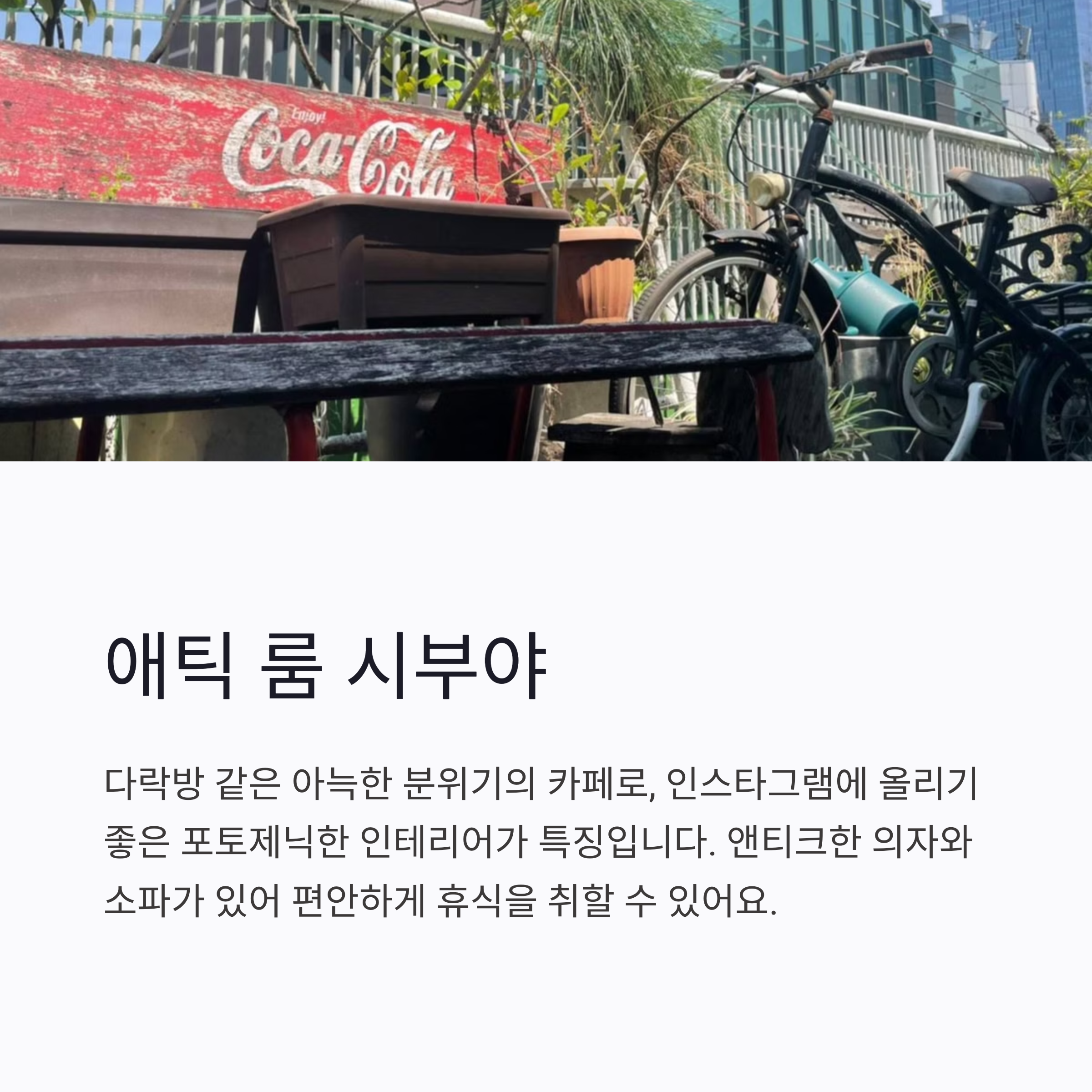 다락방 같은 아늑한 분위기의 카페로, 인스타그램에 올리기 좋은 포토제닉한 인테리어가 특징이에요. 앤티크한 의자와 소파가 있어 편안하게 휴식을 취할 수 있어요. 점심 메뉴는 16시까지 제공되며, 저녁에는 주류도 즐길 수 있어요.