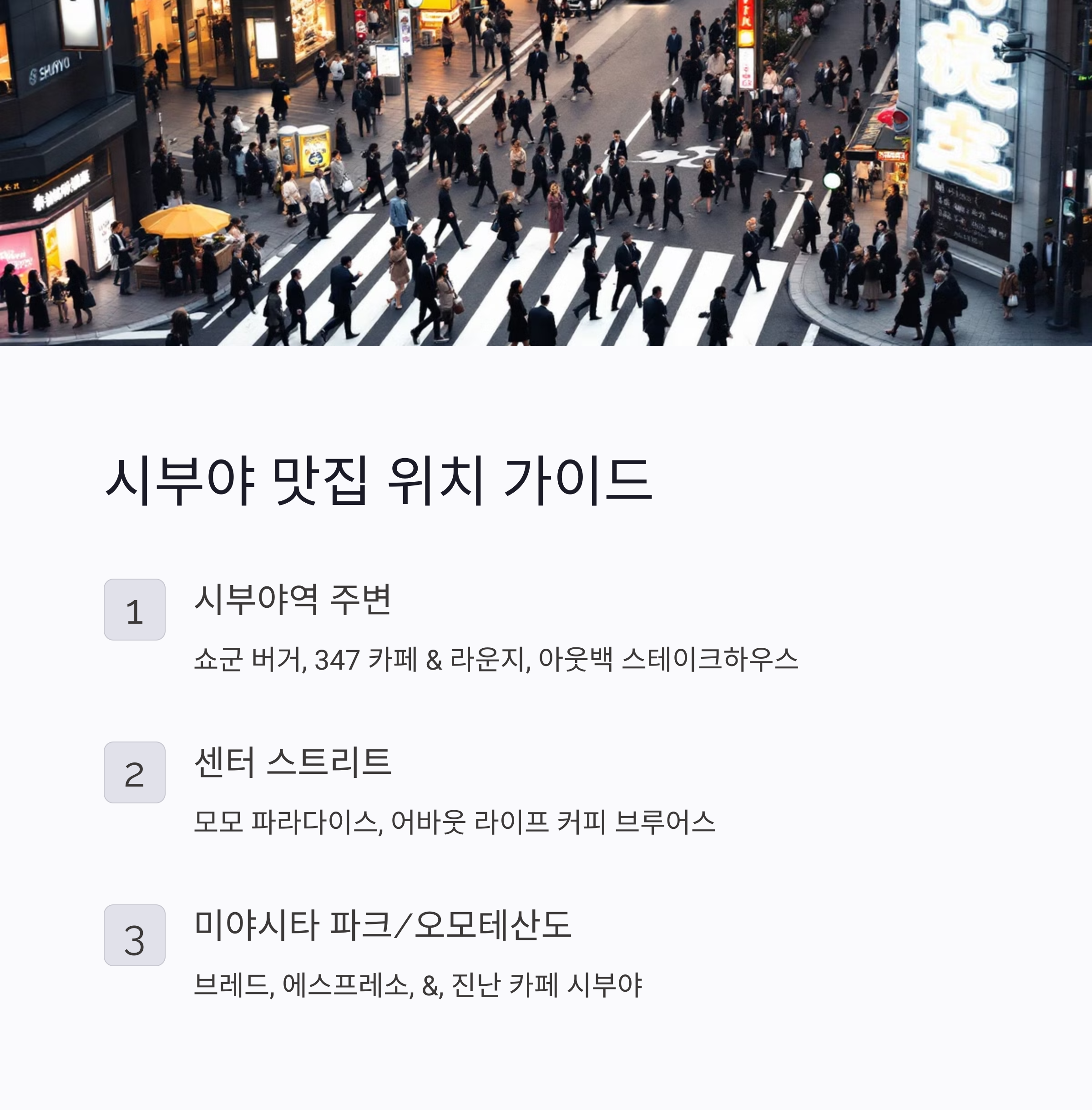 시부야는 다양한 맛집과 트렌디한 카페들이 모여 있는 곳이에요. 쇼핑과 관광의 중심지인 만큼 맛있는 음식과 분위기 좋은 카페에서의 휴식은 시부야 여행을 더욱 특별하게 만들어 줄 거예요. 이 가이드를 참고해서 여러분만의 시부야 맛집 투어를 계획해보세요! 🍰🍣