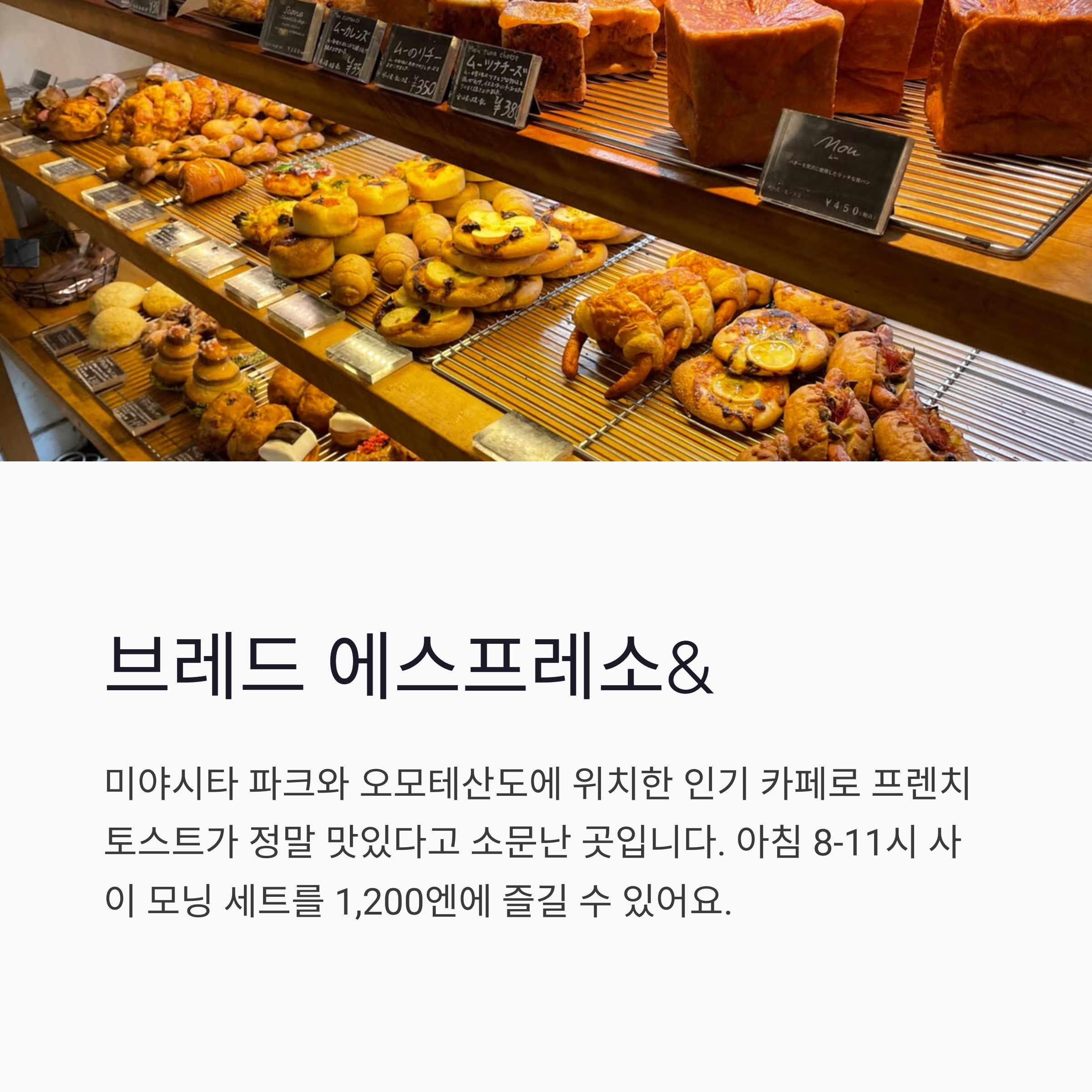 시부야 미야시타 파크와 오모테산도에 위치한 인기 카페예요. 특히 프렌치 토스트가 정말 맛있다고 소문난 곳이에요. 아침 8-11시 사이에는 샐러드와 음료가 포함된 모닝 세트를 1,200엔에 즐길 수 있어요.