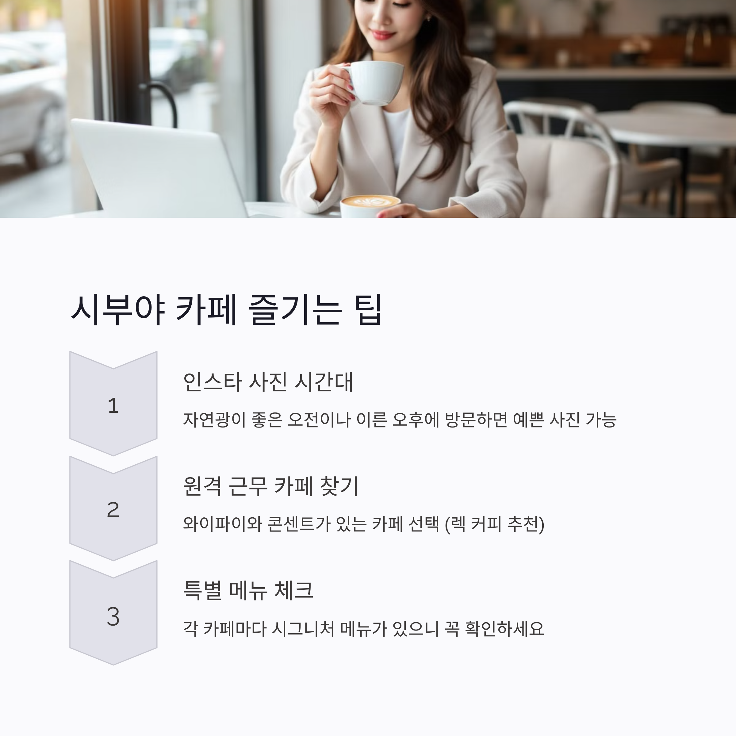 - 인스타그램용 카페 방문 시간: 포토제닉한 카페는 자연광이 좋은 오전이나 이른 오후에 방문하면 더 예쁜 사진을 찍을 수 있어요.