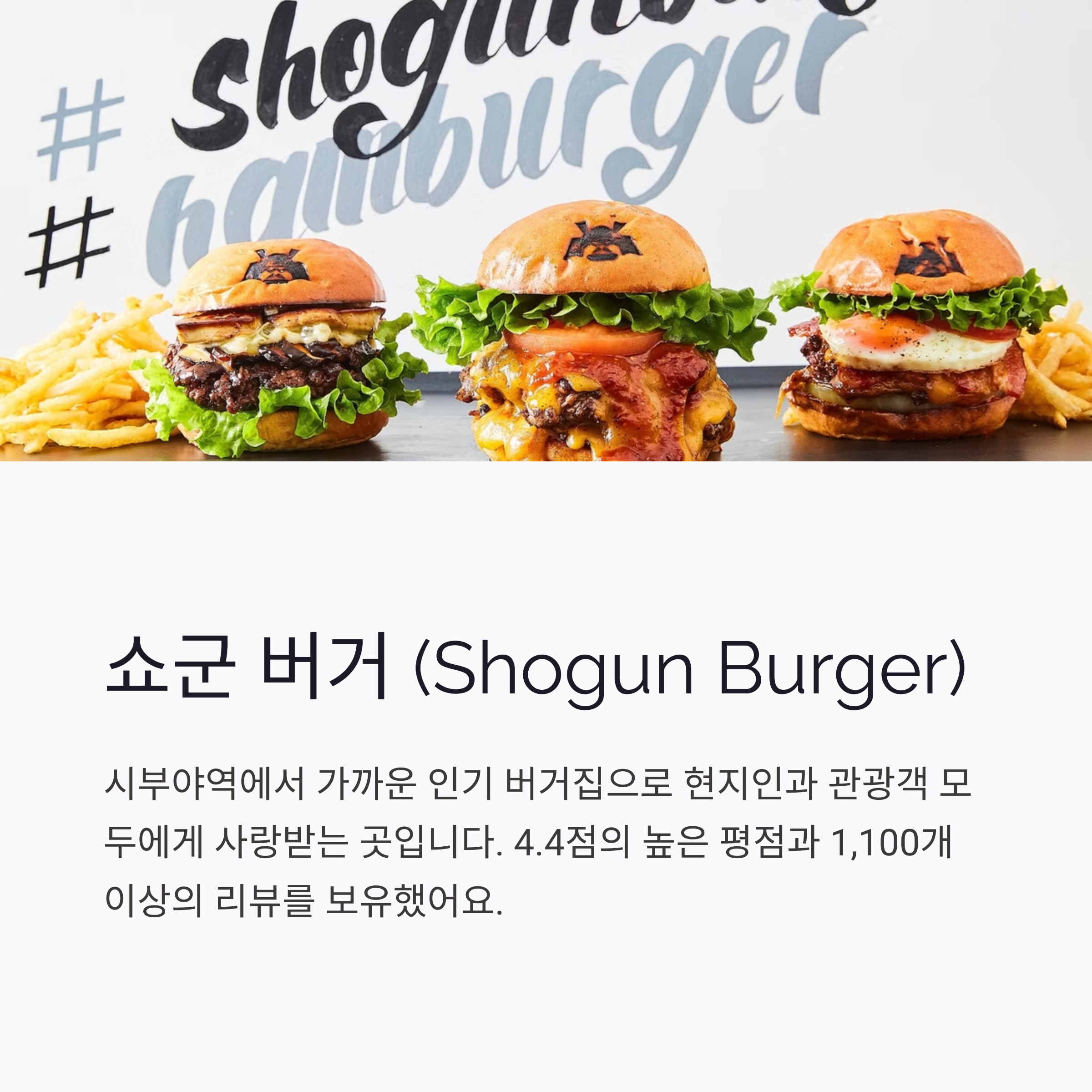 실사용 후기: "버거 패티가 두툼하고 육즙이 풍부해서 정말 맛있었어요. 특히 테라스 자리에서 먹는 버거는 시부야의 분위기를 느끼기에 최고였습니다. 혼밥하기도 좋은 분위기라 부담 없이 방문했어요."
