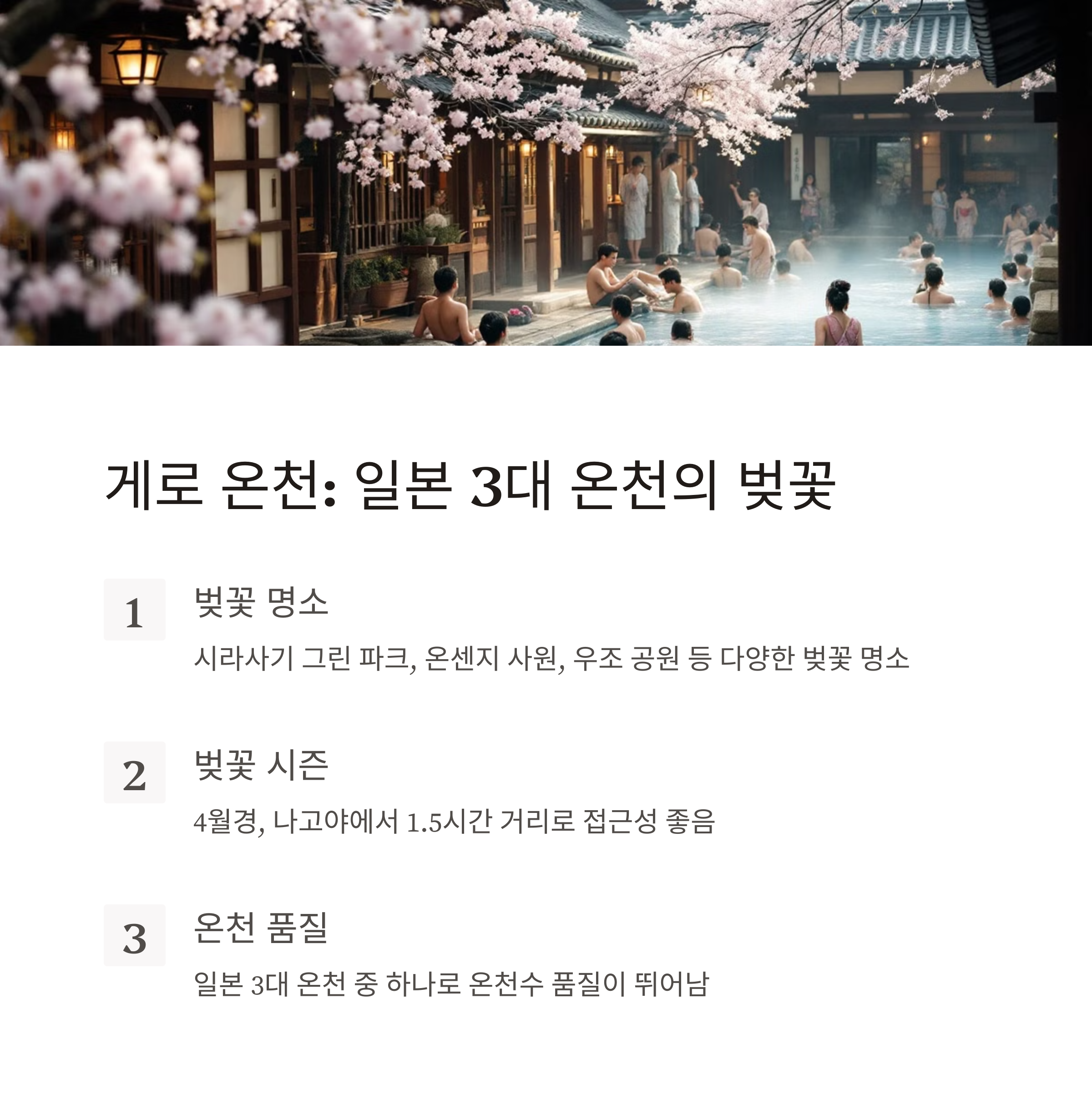 실사용 후기: 게로 온천은 일본 3대 온천이라는 명성에 걸맞게 온천수 품질이 정말 좋았어요. 게로 역에서 도보로 이동 가능한 벚꽃 명소들이 많아 온천과 벚꽃 구경을 편리하게 즐길 수 있었답니다. 특히 우조 공원의 벚꽃은 정말 아름다웠어요.