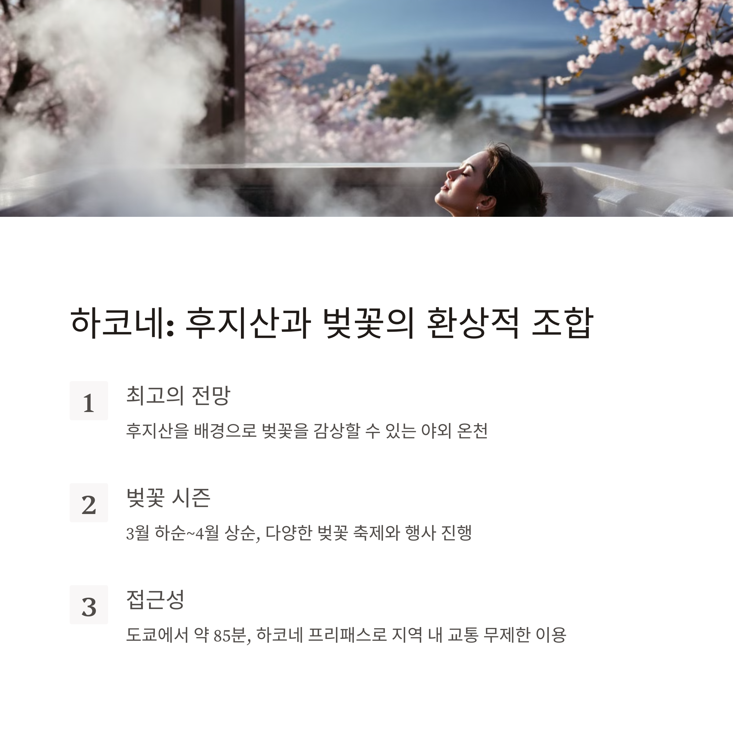 실사용 후기: 하코네의 노천탕에서 후지산과 벚꽃을 동시에 감상했는데, 그 풍경이 너무 아름다워 시간 가는 줄 몰랐어요. 특히 저녁에 조명이 켜진 벚꽃은 마치 동화 속 세상 같았답니다. 온천의 따뜻함과 벚꽃의 아름다움이 완벽한 조화를 이루는 경험이었어요.