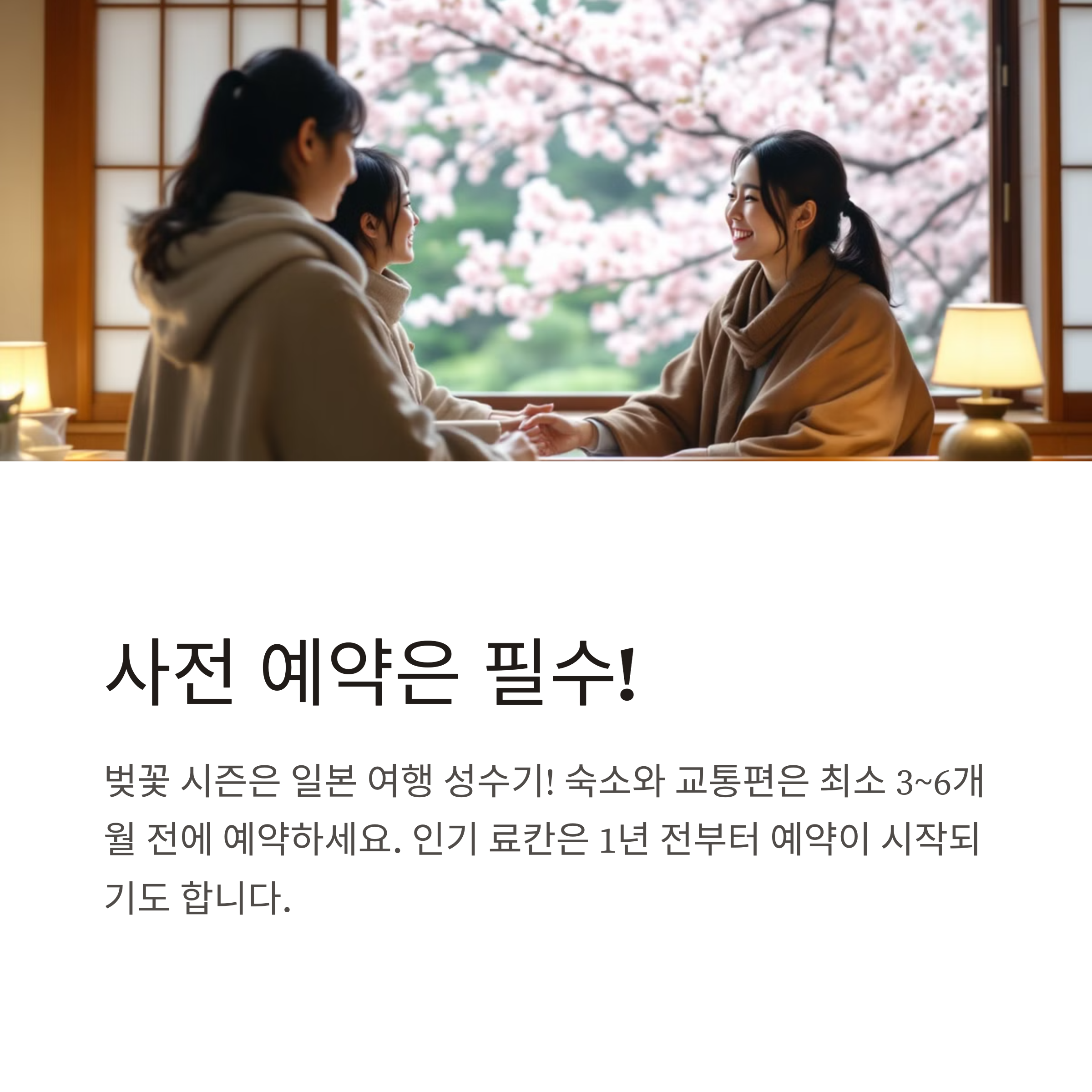 6. 사전 예약 필수: 벚꽃 시즌은 일본 여행 성수기이므로 숙소와 교통편은 최소 3~6개월 전에 예약하는 것이 좋아요. 특히 인기 료칸은 1년 전부터 예약이 시작되기도 합니다.