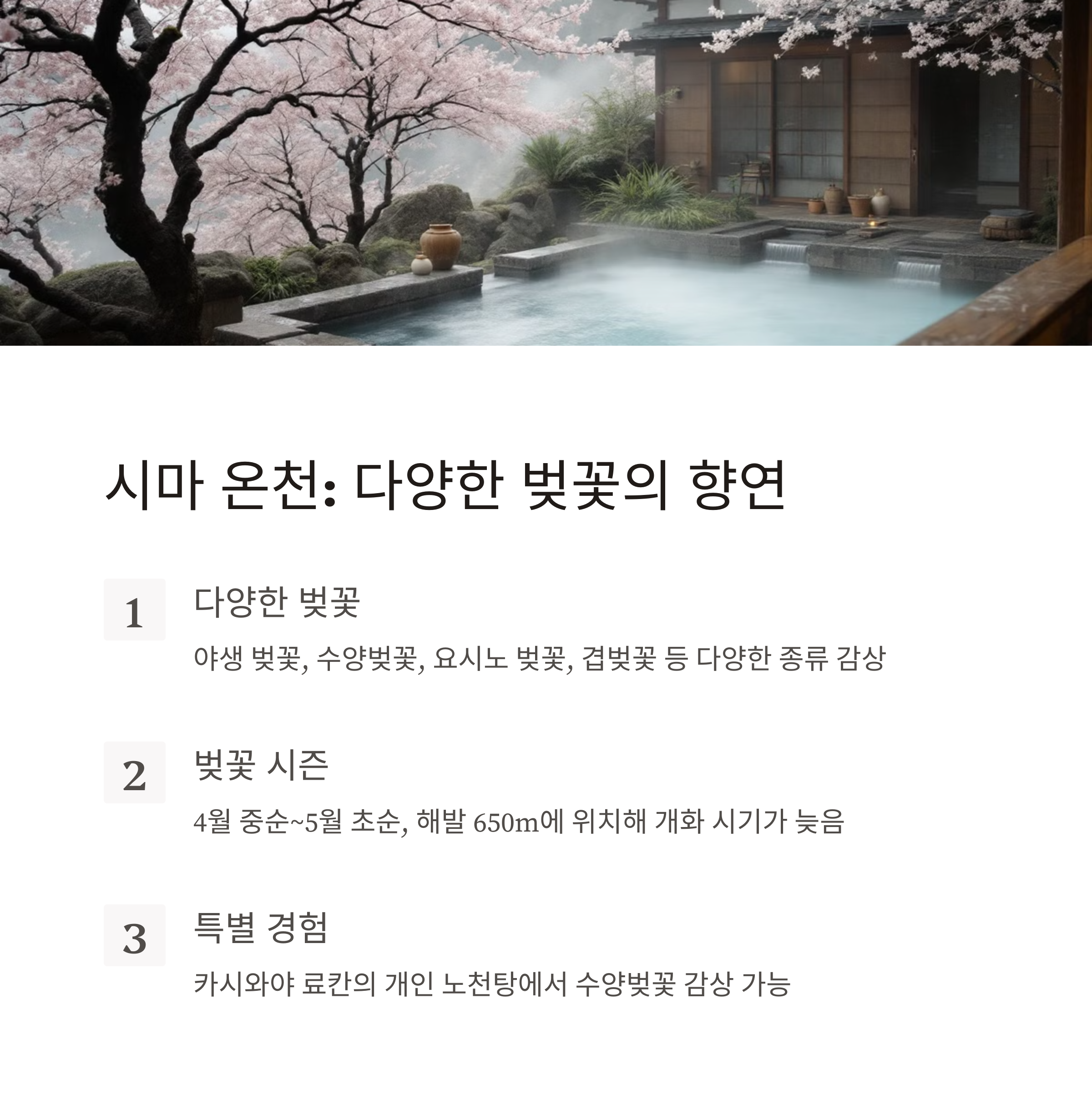 실사용 후기: 시마 온천에서는 산속에 피어있는 다양한 종류의 벚꽃을 볼 수 있어 색다른 경험이었어요. 특히 카시와야 료칸의 노천탕에서 바라본 수양벚꽃은 정말 환상적이었답니다. 다른 온천지보다 사람이 적어 여유롭게 벚꽃과 온천을 즐길 수 있었어요.