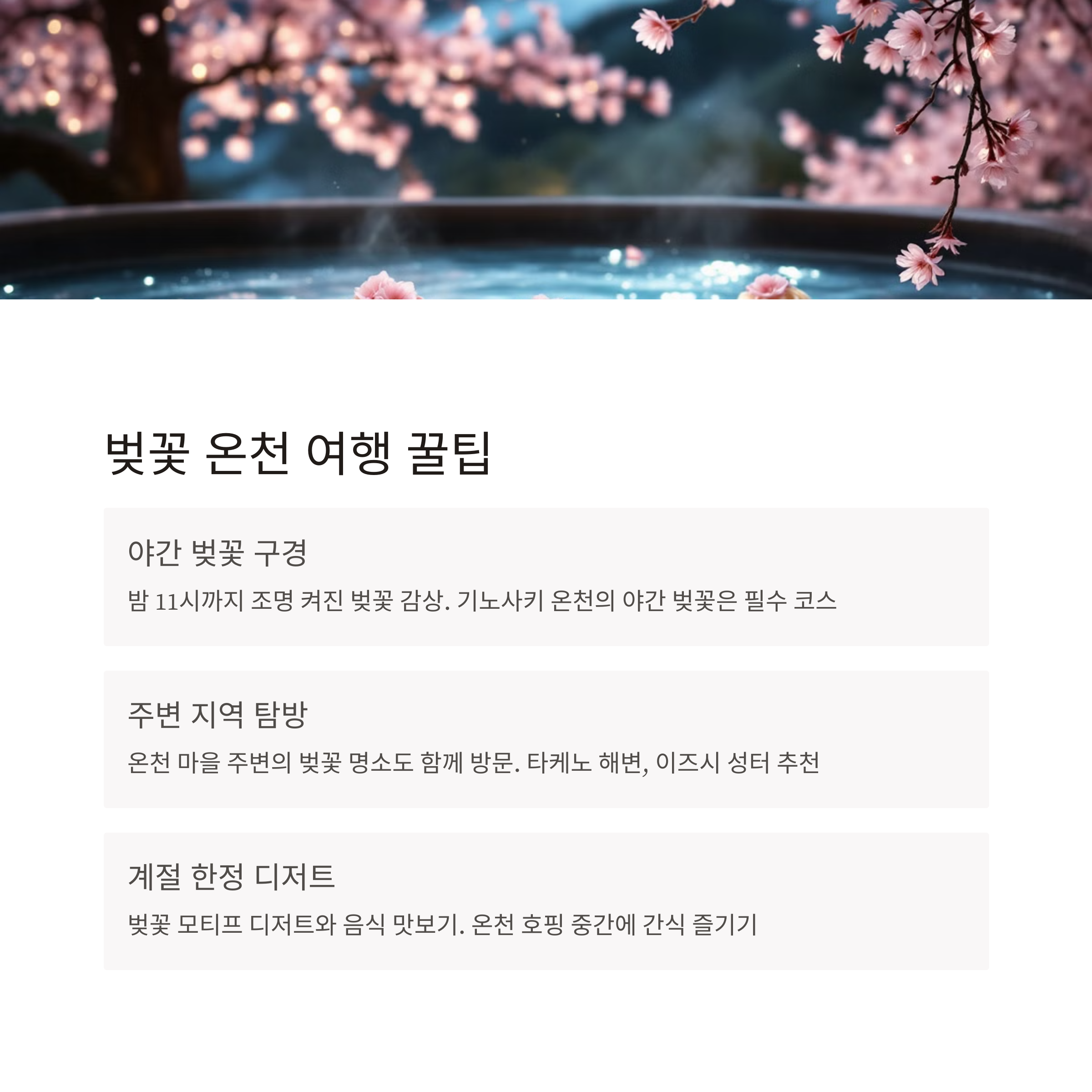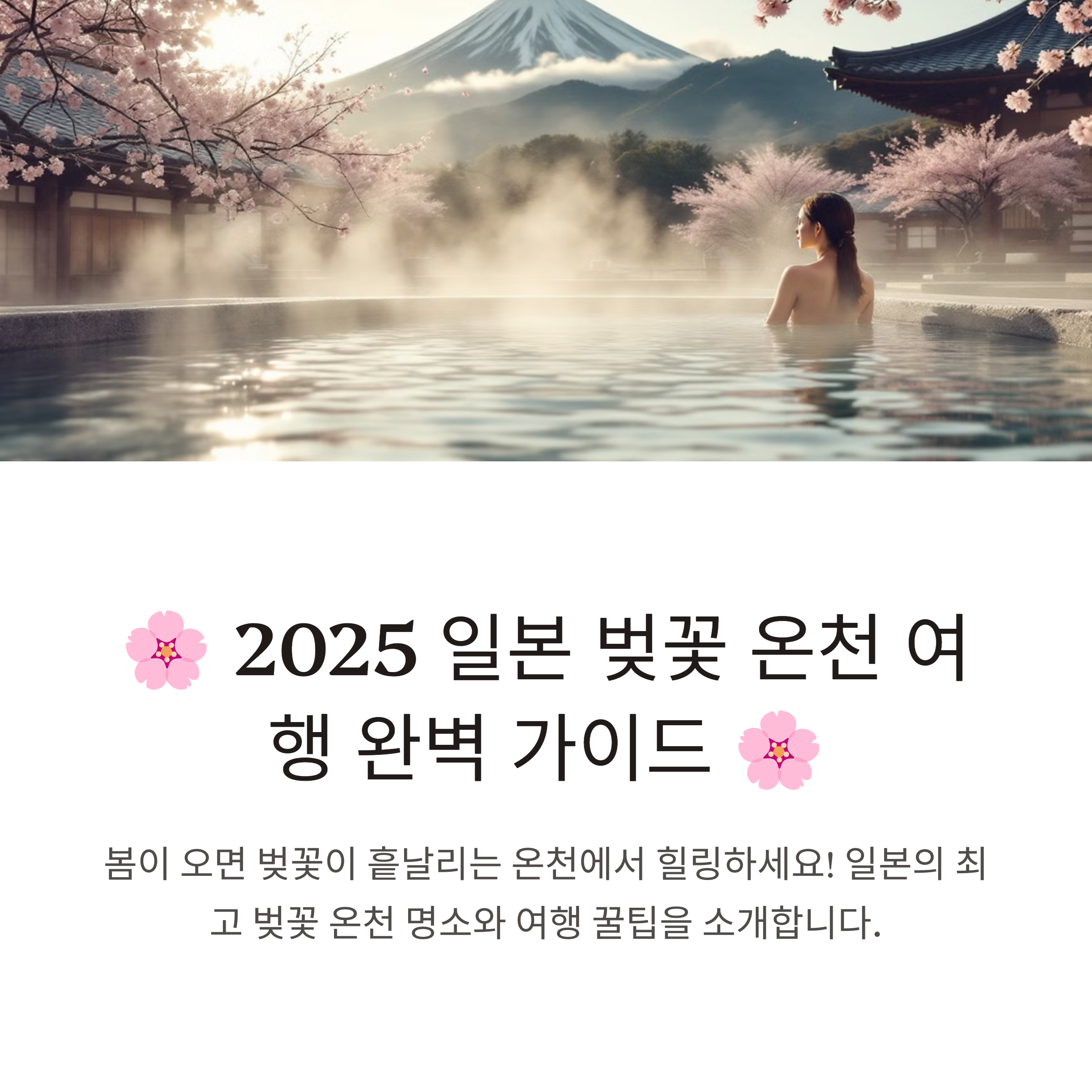 일본의 벚꽃과 온천을 동시에 즐길 수 있는 여행은 정말 특별한 경험이 될 거예요. 2025년 봄, 아름다운 벚꽃이 흩날리는 온천에서 힐링의 시간을 가져보세요! 🌸♨️