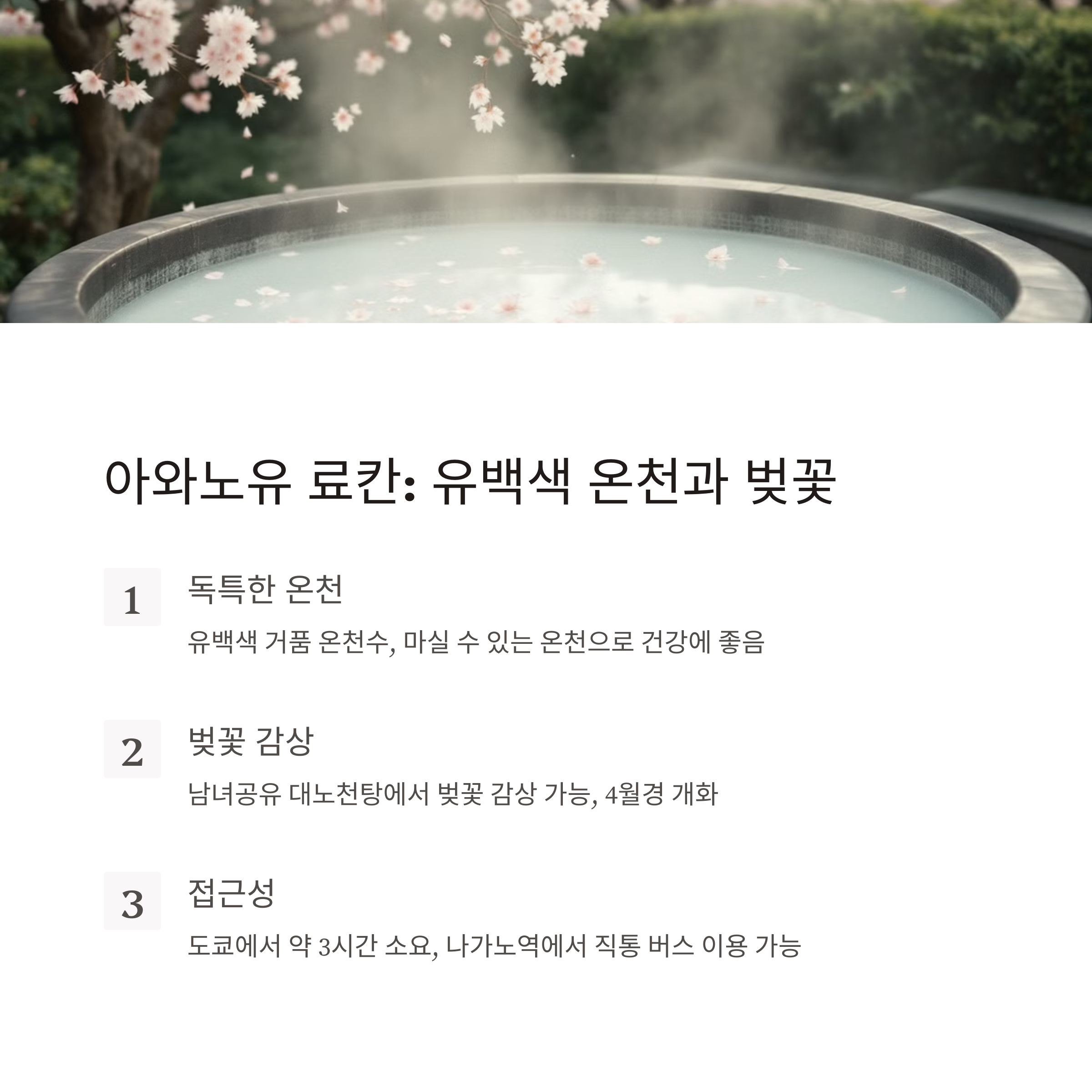 실사용 후기: 아와노유 료칸의 대노천탕은 정말 특별했어요. 유백색의 온천수가 피부에 닿는 느낌이 부드럽고, 벚꽃이 흩날리는 모습을 바라보며 온천을 즐기니 일본 여행의 진수를 느낄 수 있었답니다. 온천수를 마셔보기도 했는데, 산미가 있지만 건강에 좋다고 하니 도전해보세요!