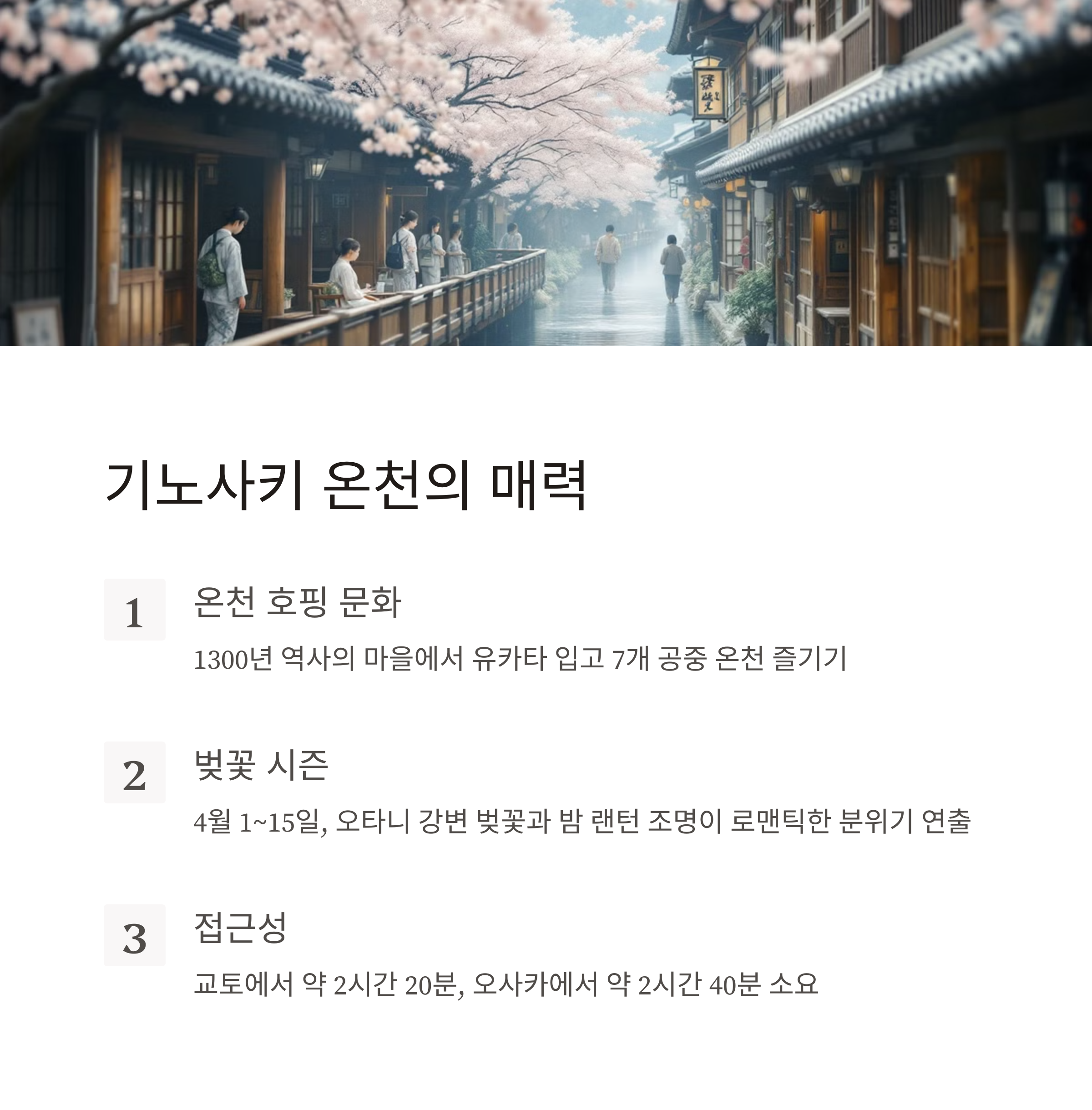 실사용 후기: 기노사키 온천의 이치노유 온천에서 벚꽃을 바라보며 온천을 즐겼는데, 정말 환상적이었어요. 따뜻한 물에 몸을 담그고 벚꽃이 흩날리는 모습을 보니 일본 여행의 진정한 매력을 느낄 수 있었답니다. 온천 호핑을 하면서 다양한 온천의 특색을 경험할 수 있어 더욱 특별했어요.