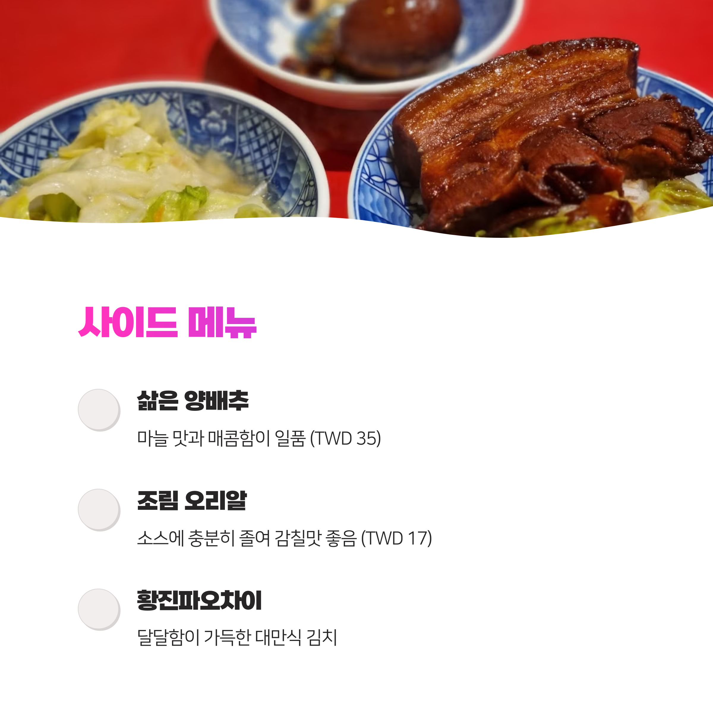 - 황진파오차이(대만식 김치): 매콤한 맛 대신 달달함이 가득한 특별한 김치!